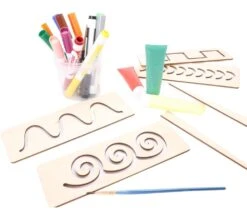 12 pochoirs en bois contreplaqué pour apprendre à tracer des traits, des courbes, toutes sortes de formes qui initieront les enfants à l’écriture. En suivant les lignes avec le crayon en bois les enfants développeront leur motricité fine et dès qu’ils utiliseront des crayons de couleur ils pourront combiner les formes au gré de leur imagination pour créer de jolis dessins tout en s’amusant ils gagneront en dextérité et faciliteront leur progrès en calligraphie.