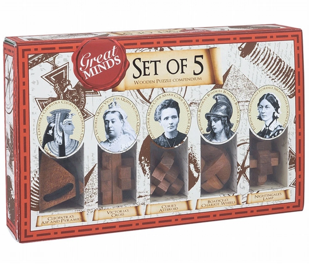 Un très beau coffret pour rendre hommage aux grands esprits. Ce kit Femmes célèbres vous propose 5 très beaux casse-têtes en bois. Boite de 5 casse-têtes originaux sur le thème des femmes puissantes : la pyramide de Cléopâtre, la molécule de Marie Curie, la lampe de Florence Nightingale, la croix de la reine Victoria et la boule de Boadicée. 5 casse-têtes en bois dans un beau coffret à offrir. De Cléopâtre à Marie Curie, il faut résoudre ces casse-têtes seul ou en tournoi avec plusieurs participants. Qui va finir le premier ? De beaux moments de jeux en perspective. Mets tes capacités à l’épreuve avec ces puzzles inspirés de ces femmes célèbres.