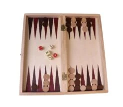 - 1 plateau en bois de 29 x 29 cm ouvert avec impression d’un échiquier sur l’extérieur et d’un plateau de jeu de backgammon sur l’extérieur. Pliable en 2 pour l’utiliser comme coffret.