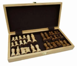 Un joli petit coffret de jeu d’échecs tout en bois facile à ranger et transporter.