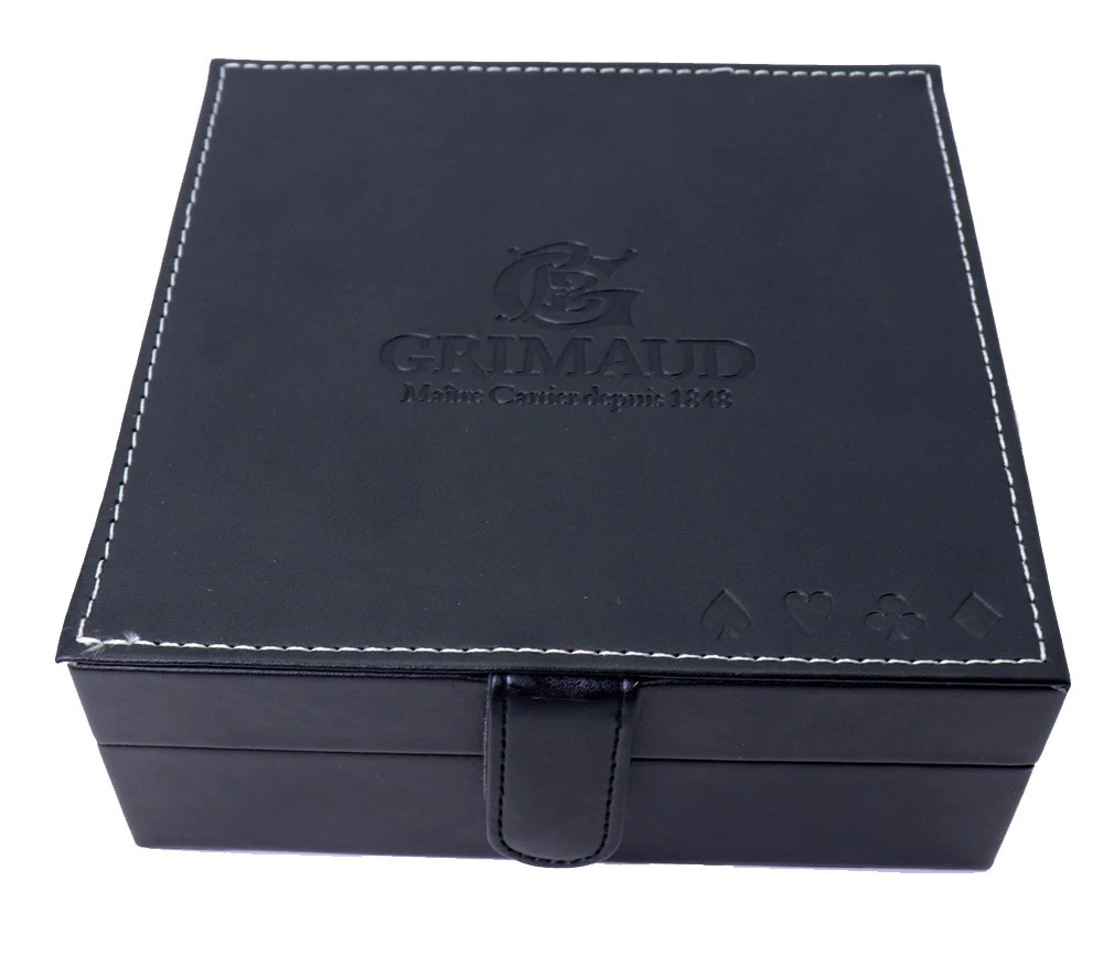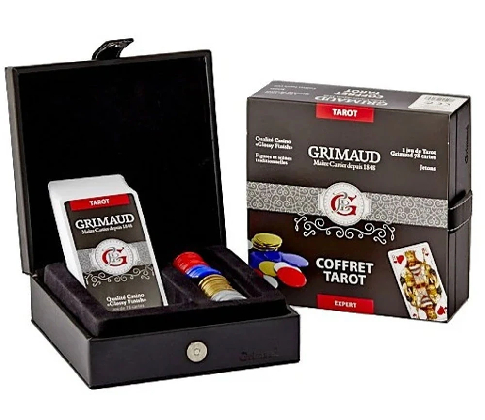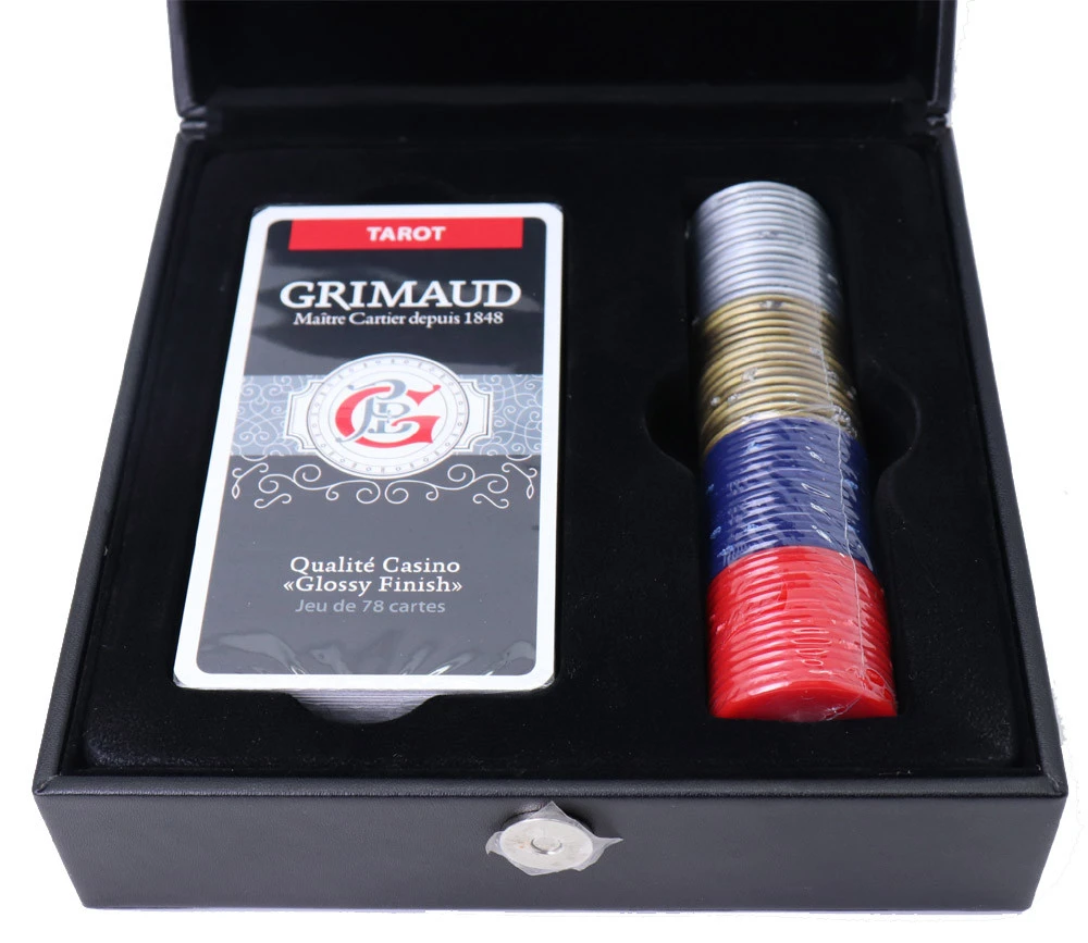 Beau coffret Tarot façon cuir complet pour les passionnés de jeu de Tarot avec jeu de carte Grimaud expert, qualité « casino » et jetons colorés pour marquage des points.