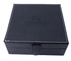 Coffret noir de 15.5 x 15.5 x 6 cm avec couvercle qui se referme à l’aide d’une pression aimantée contenant :