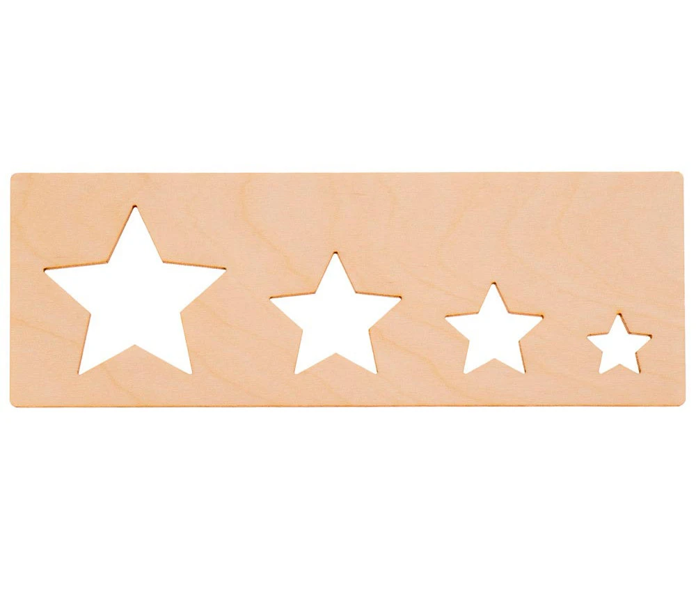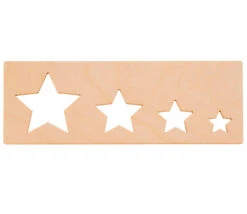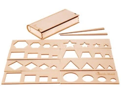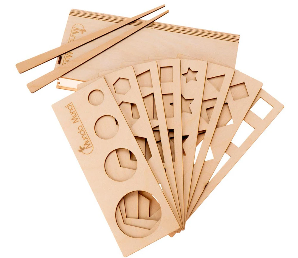 À l’aide des pochoirs, un enfant se familiarisera avec les formes géométriques et le concept de grand et petit, plus ou moins.