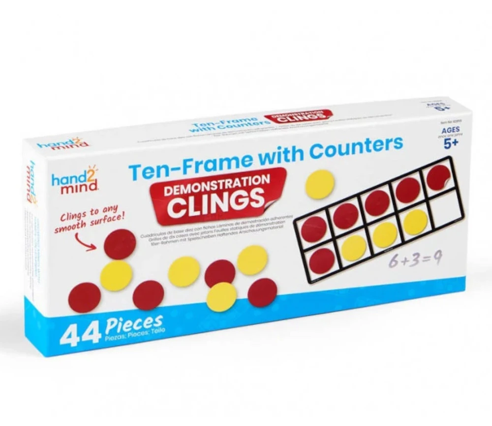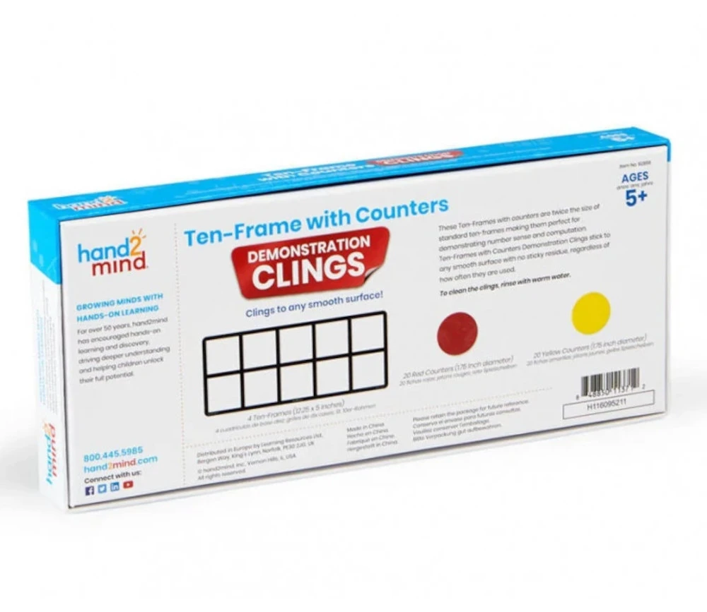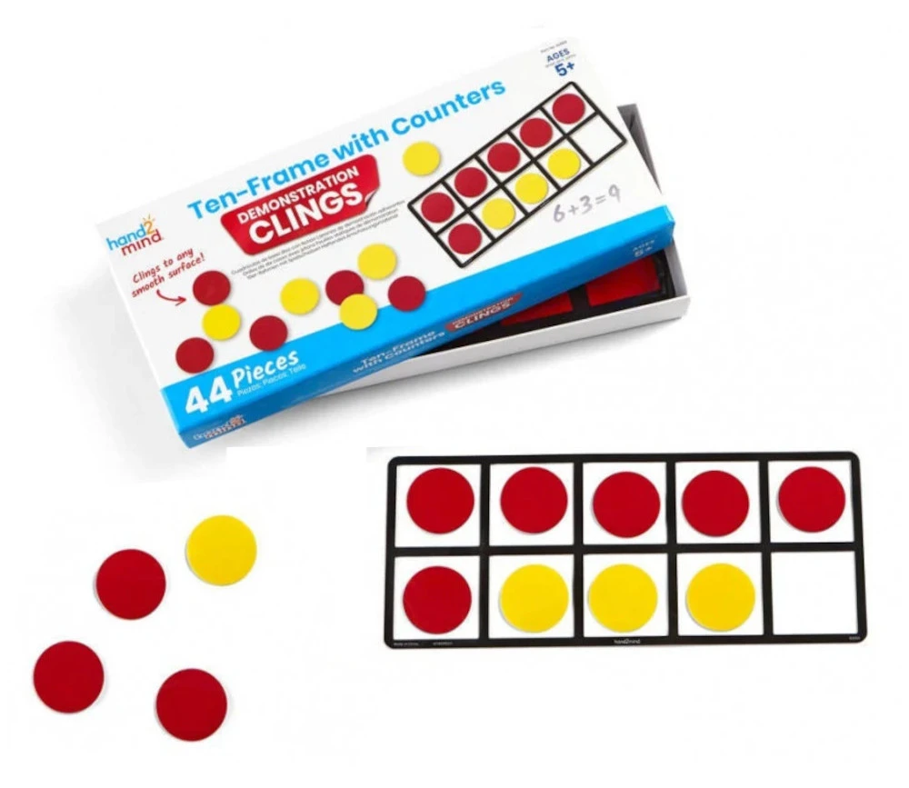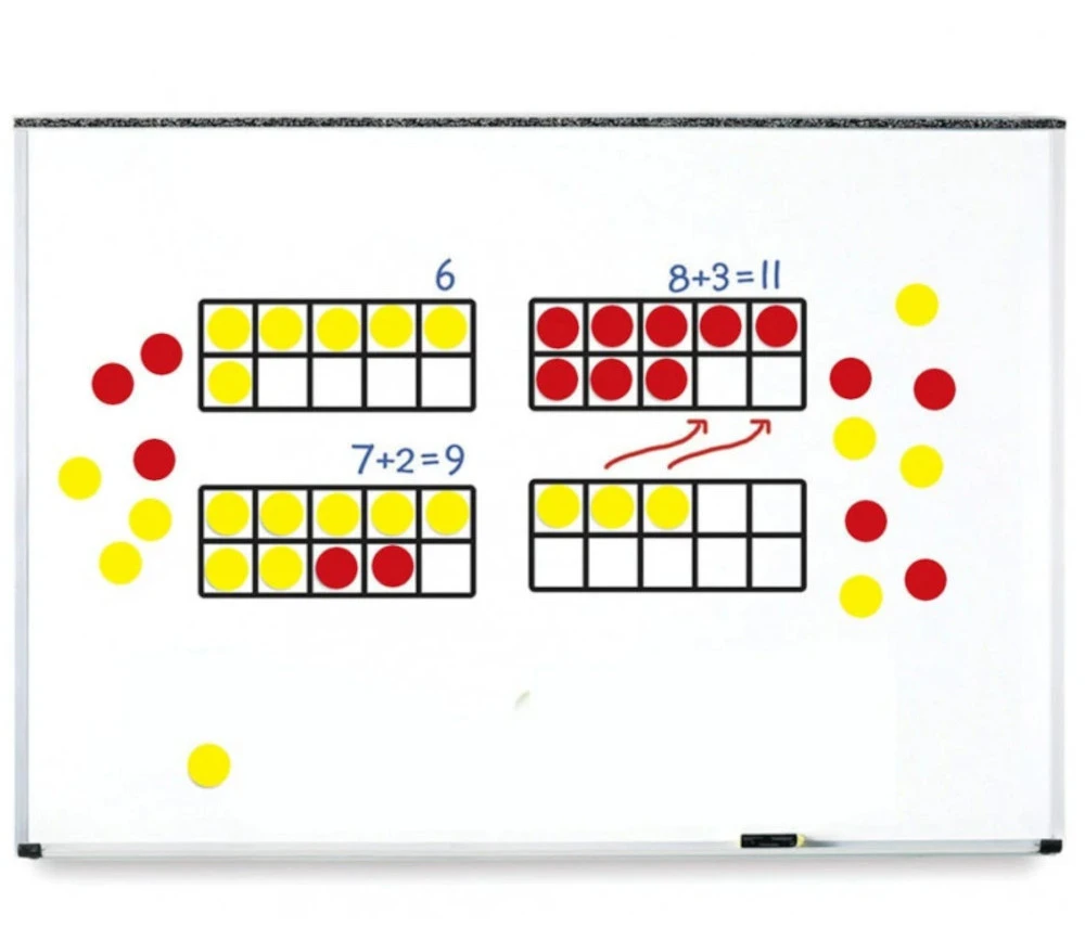 Ten-Frame démonstration comprenant 4 tableaux repositionnables avec pions repositionnables rouges et jaunes.