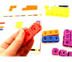 Les enfants doivent trouver la bonne réponse au calcul ou à l’énigme en emboîtant les cubes de la bonne manière.