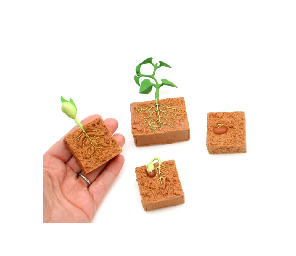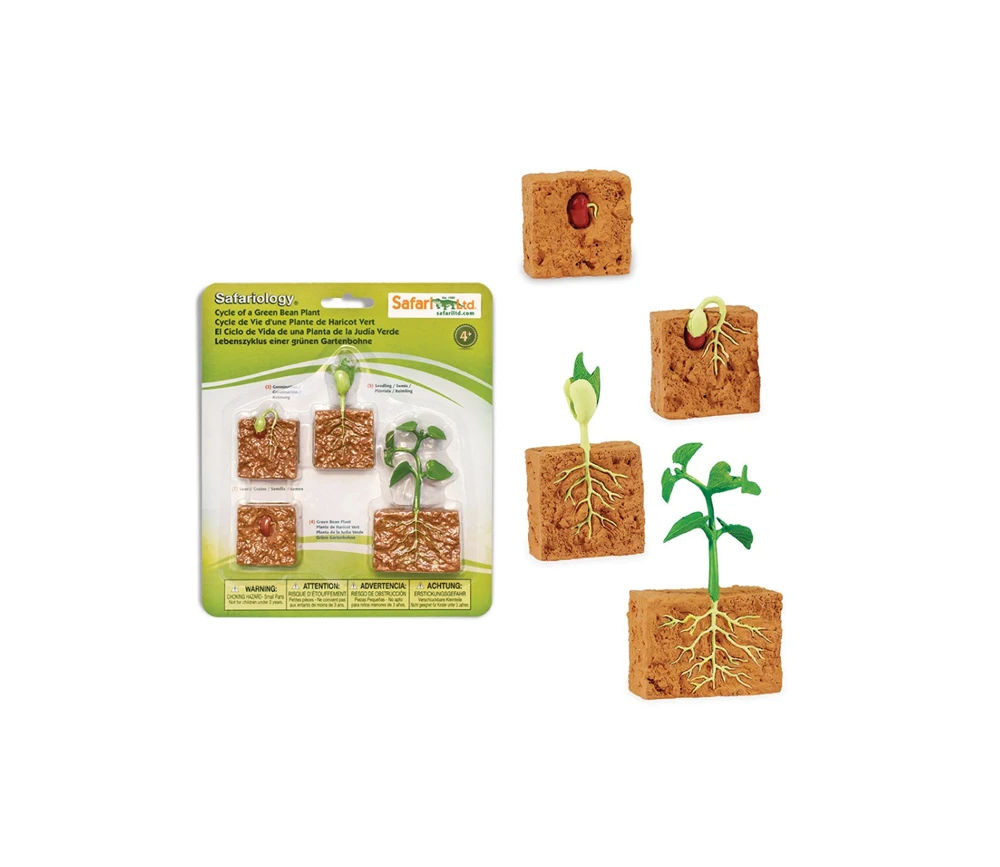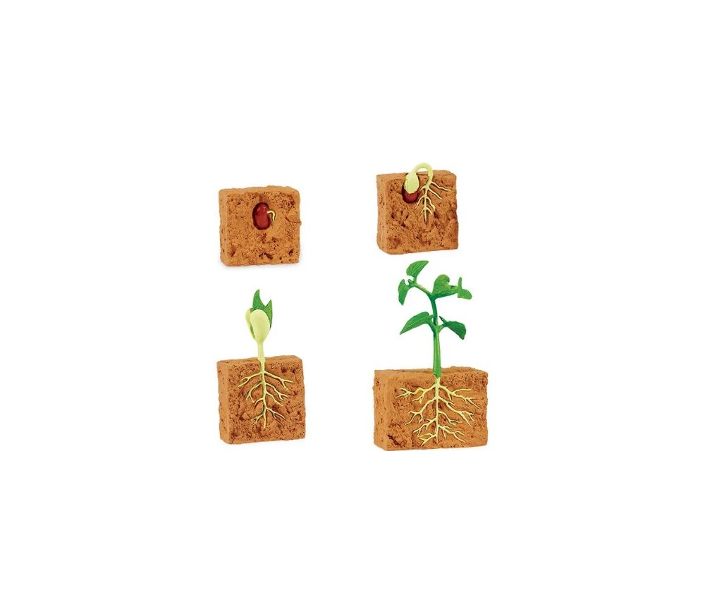Une vue de côté montre une graine de haricot verte dans le sol, suivi par les différentes étapes de germination (racines dans le sol chaud et humide, le développement de la plante puis l’apparition des feuilles. Figurine pour apprendre et découvrir les Sciences par la manipulation.