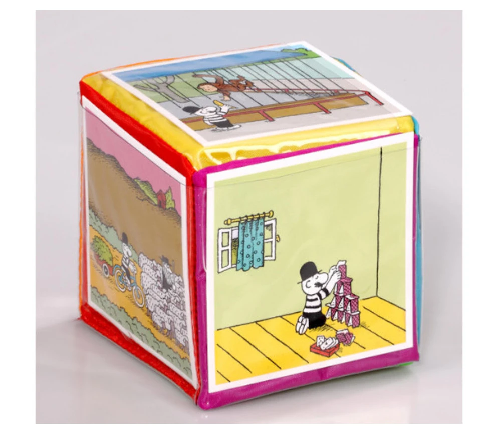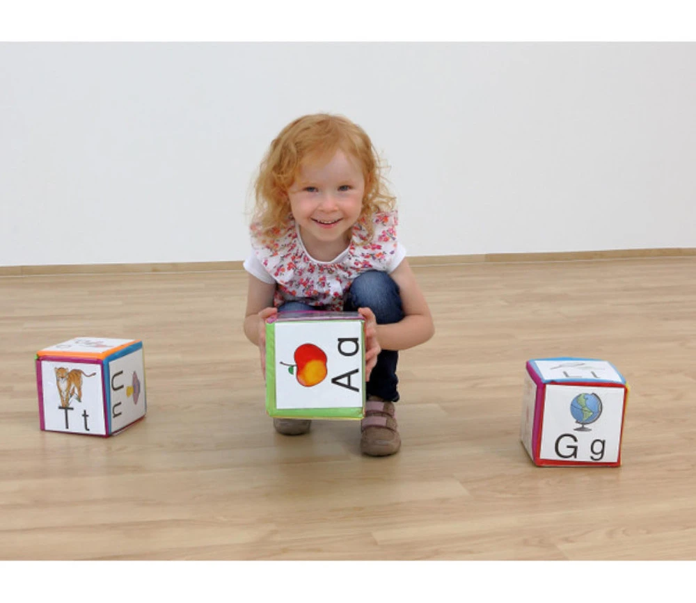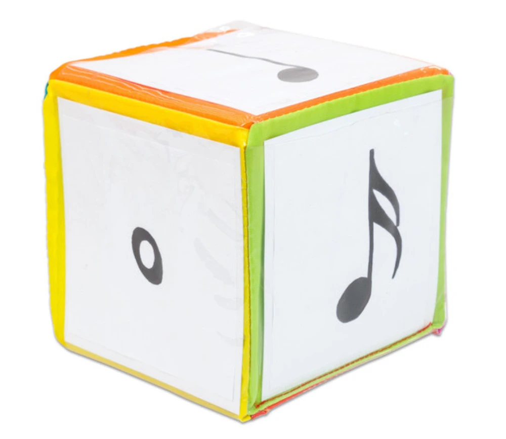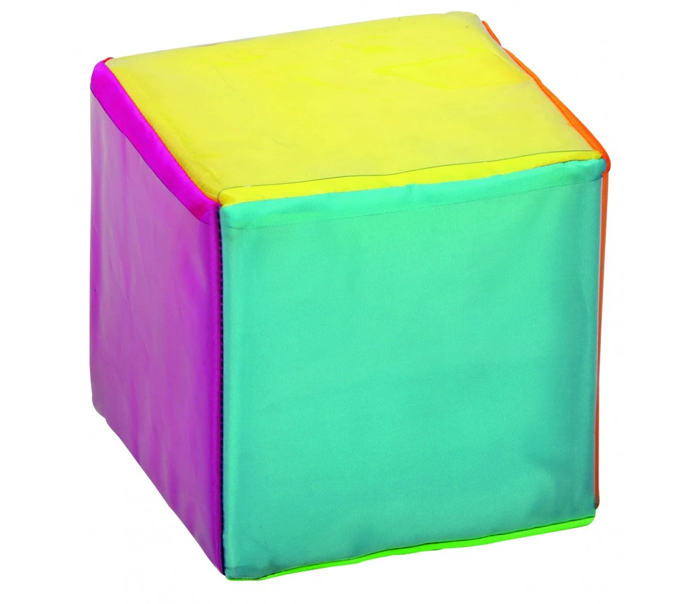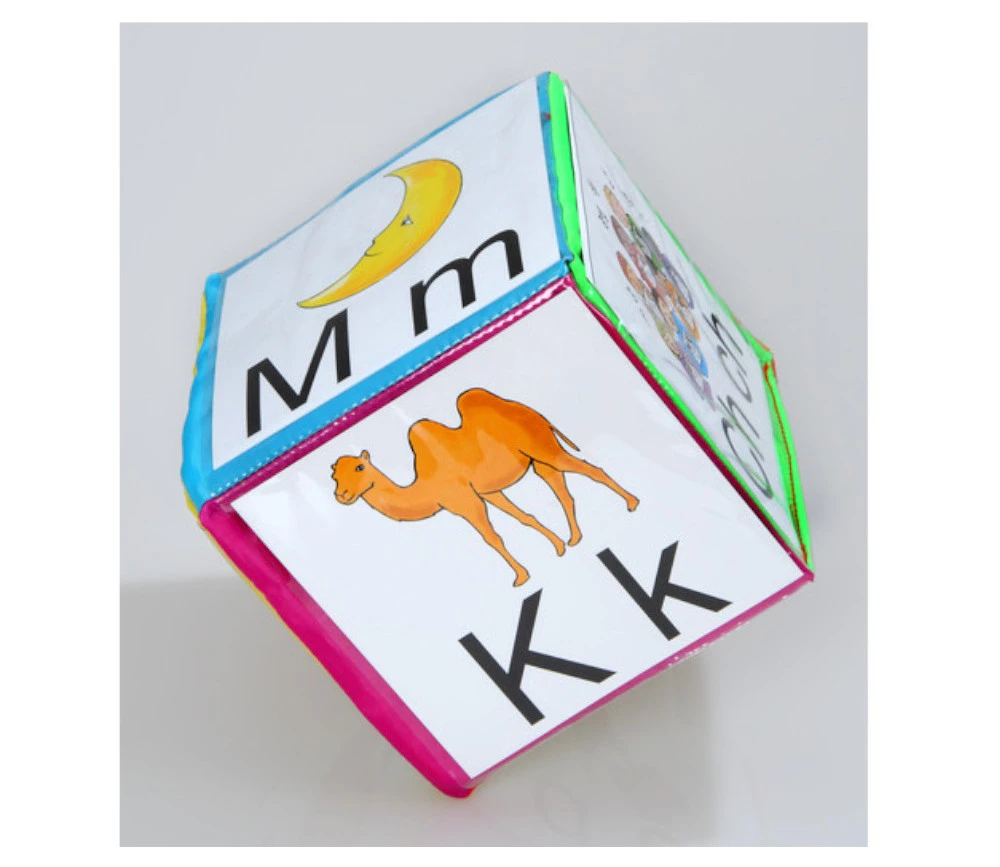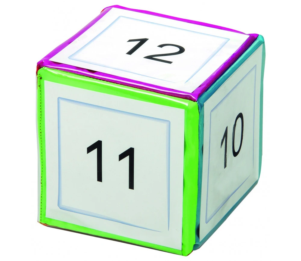 Dé à jouer en mousse recouvert d’une toile colorée lavable de 15 x 15 cm. Chaque face a des glissières transparentes pour glisser le contenu de votre choix.