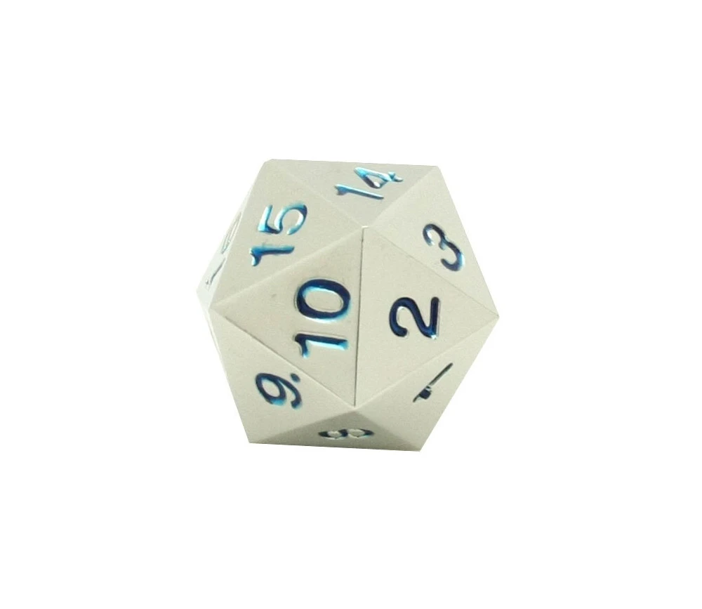Compteur de tour ou de niveau en métal couleur argenté et chiffres gravés en bleu en creux dans le métal. Ce dé à jouer est très agréable au lancer grâce à son poids. Un dé qui fait luxueux, impressionné les autres joueurs avec votre dé argent.
