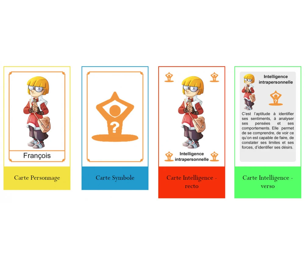 - Découverte des 8 intelligences : retrouver les séries de 2 cartes liées à un personnage puis résoudre des devinettes. (version compétitive ou collaborative)