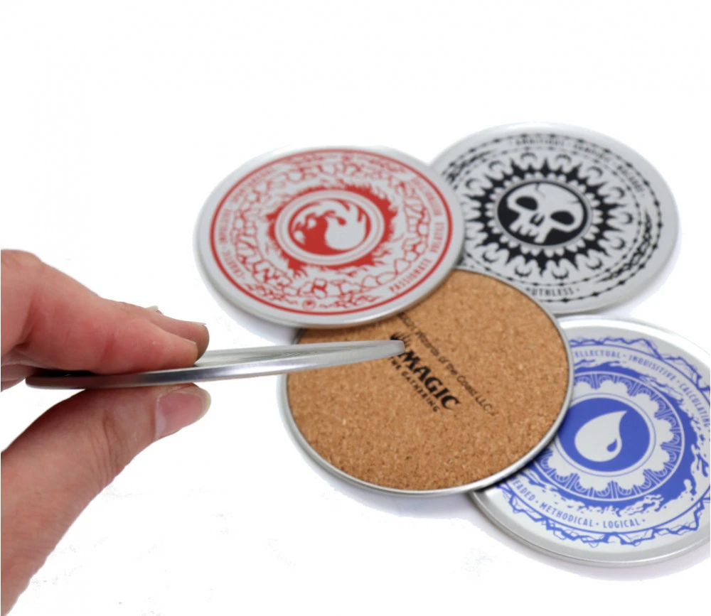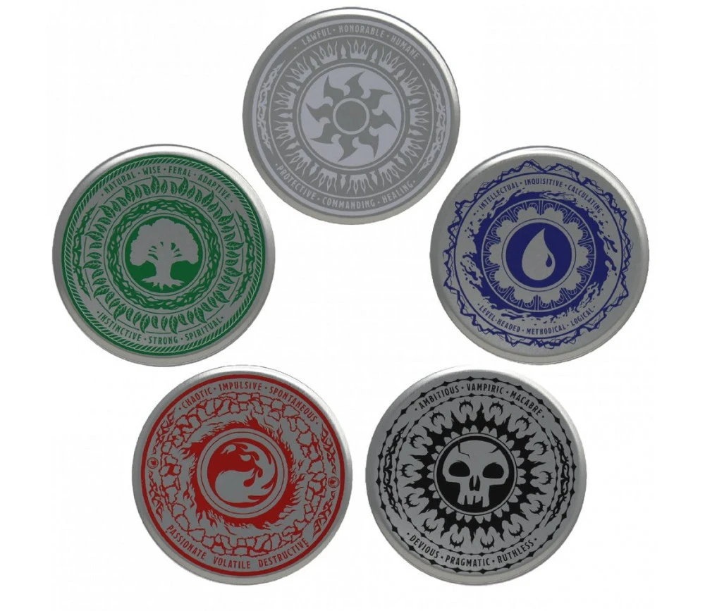 5 grands jetons base de jeux avec les 5 éléments mana : eau, terre, nature, feu et mort/vie. Sous verre en métal et dessous liège de 8.9 cm de diamètre.
