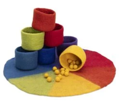 - 7 bols en feutrines de 12 cm de diamètre : violet, rouge, jaune, bleu clair, bleu foncé, vert, orange