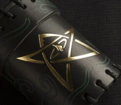 Impression gravé en couleur dorée dans le cuir d’une étoile mystérieuse.