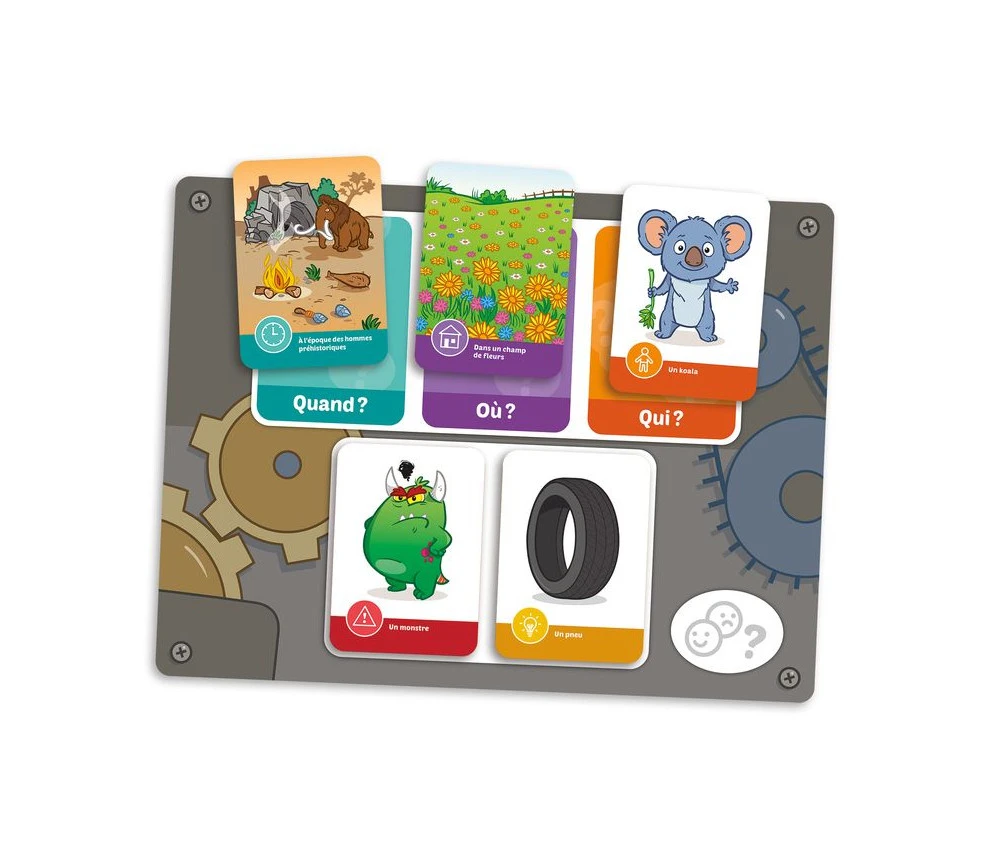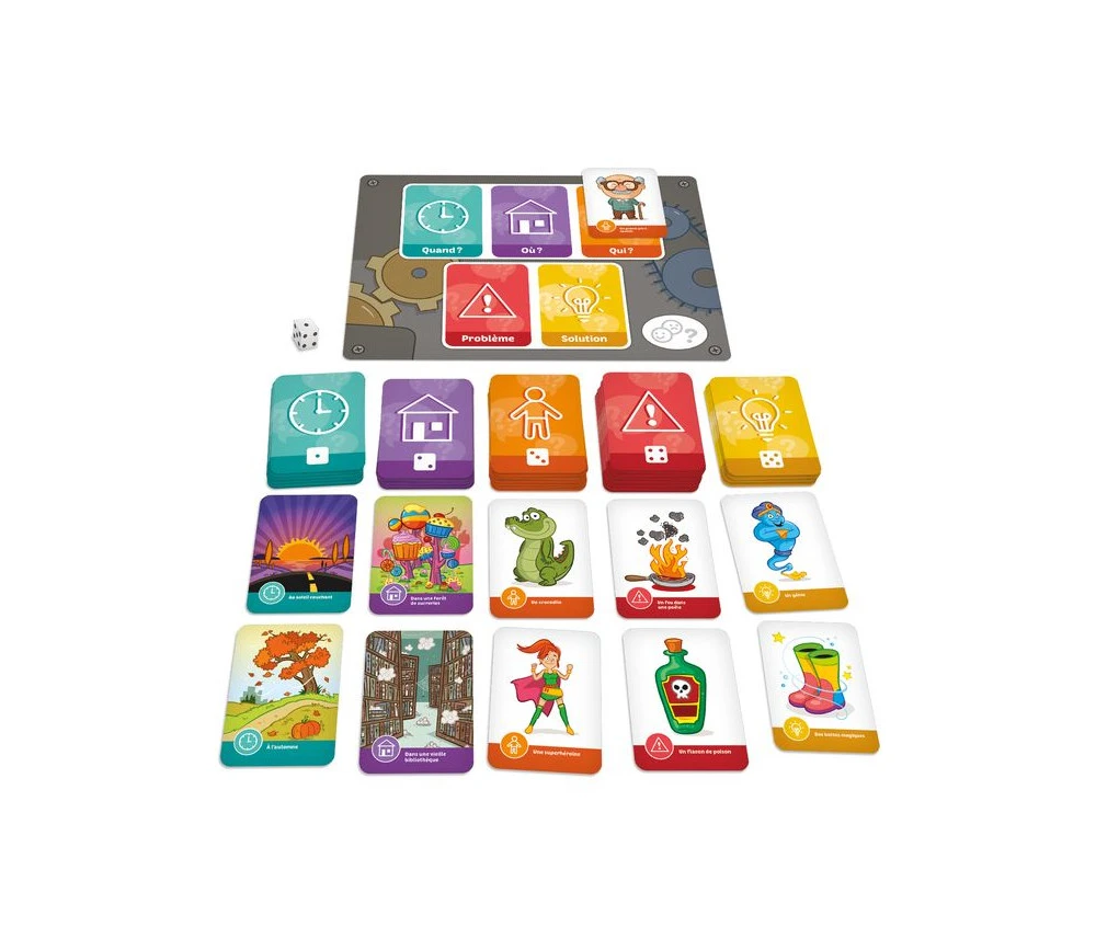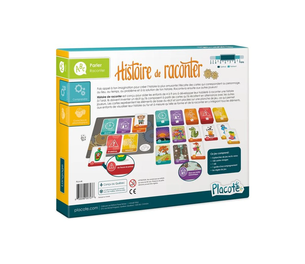 Les éléments fondamentaux des récits, tels que le temps, le lieu, le personnage, le problème et la solution, sont représentés par des cartes-images disposées stratégiquement sur le plateau de jeu, ce qui aide les enfants à visualiser et à raconter leurs histoires de manière complète et cohérente.
