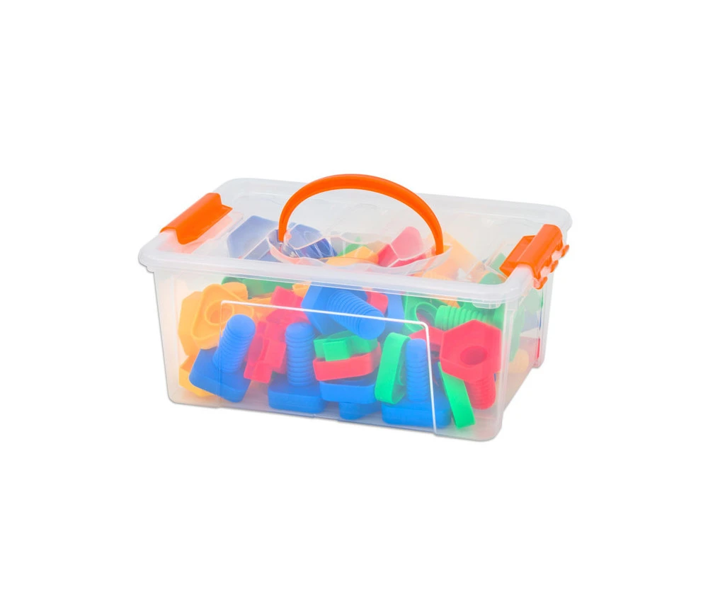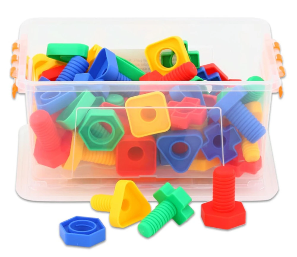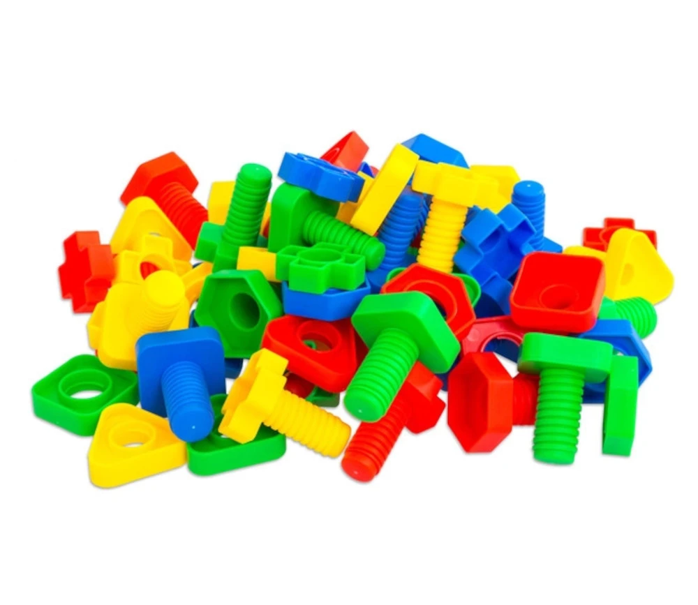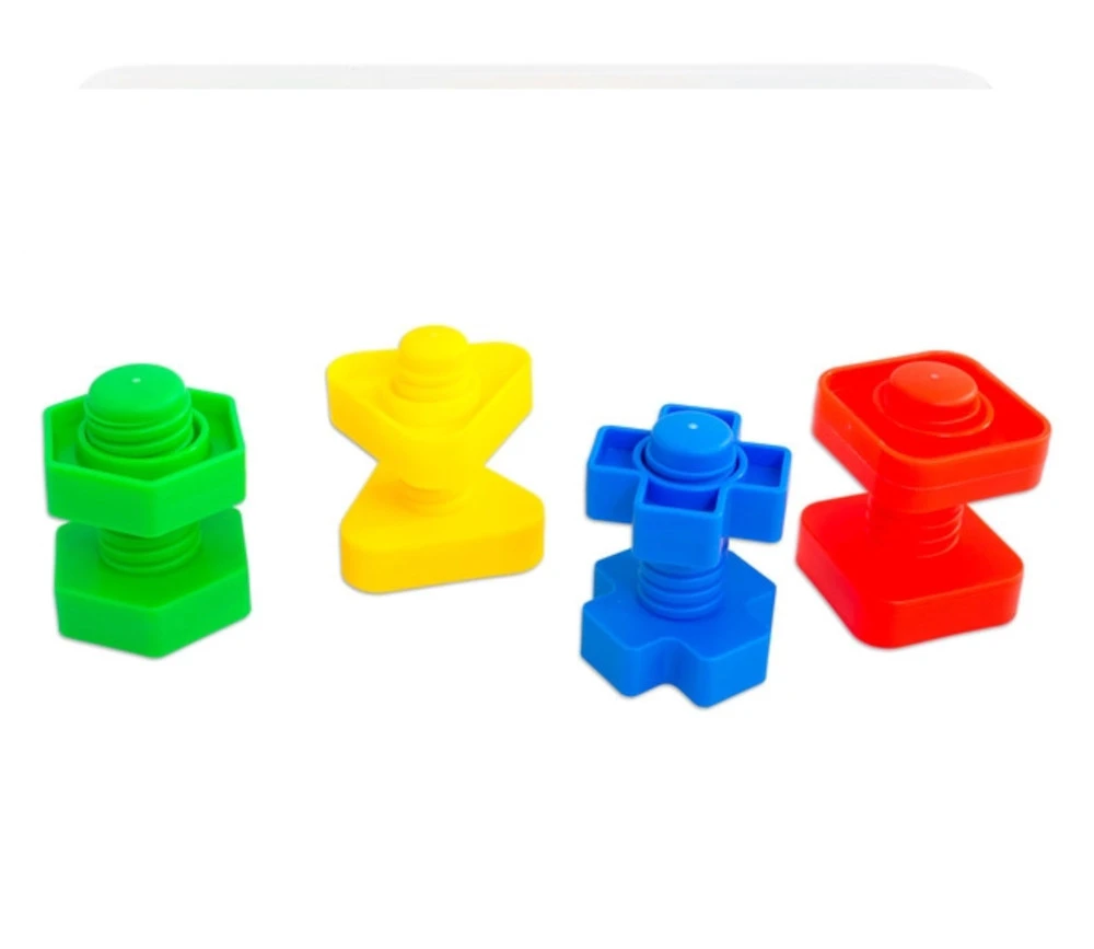 Jeu de construction vis et écrous de couleurs vives et de formes différentes (carrés, triangles, croix, hexagone).