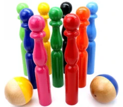 Un très beau jeu de quilles, tout en bois laqué, 9 couleurs éclatantes.