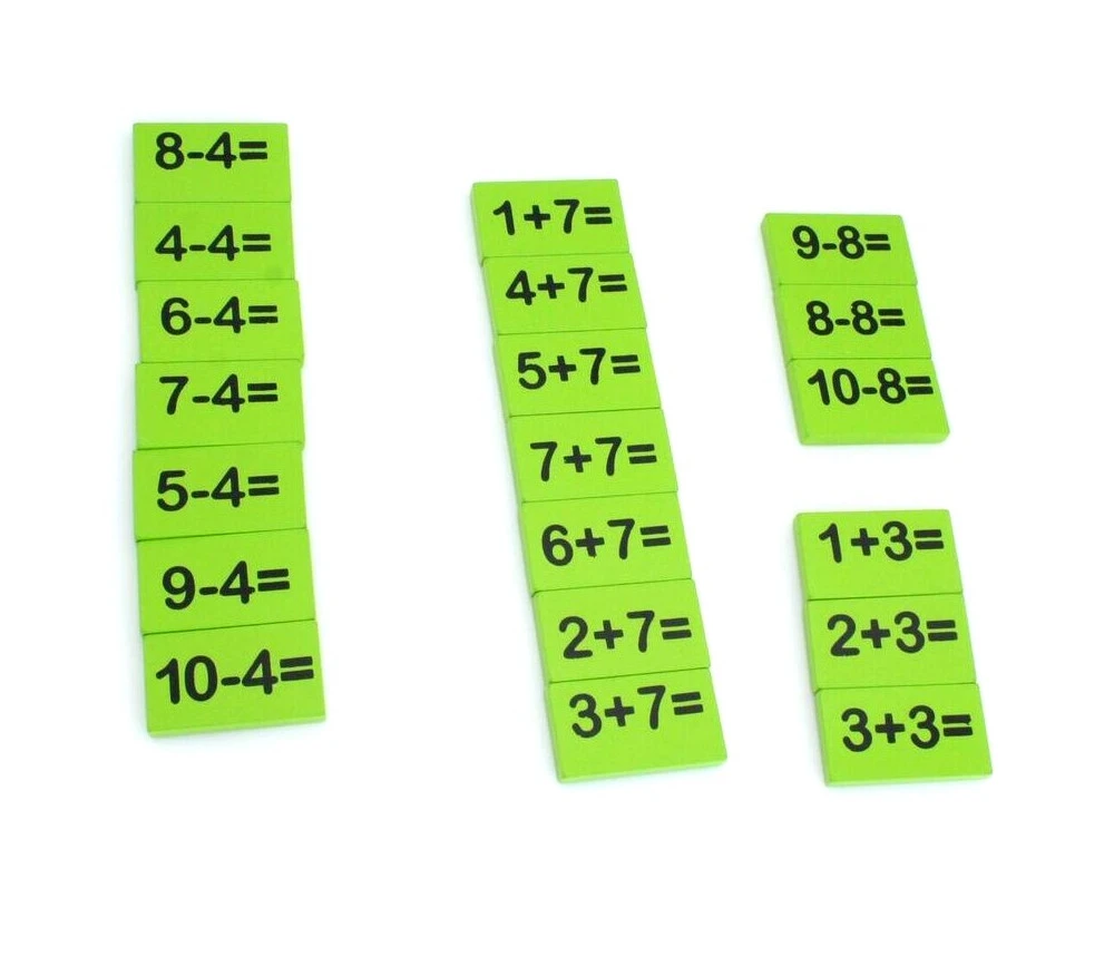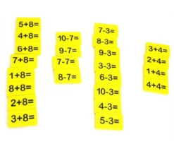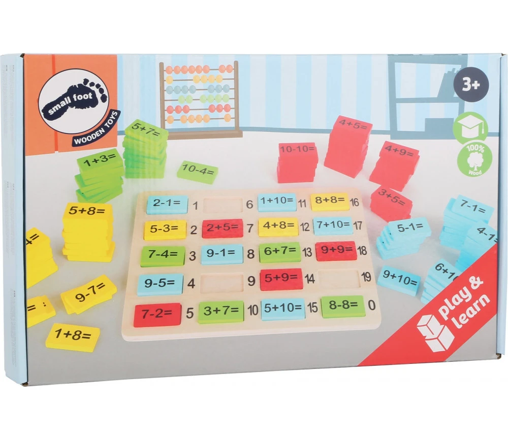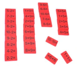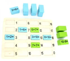 - 109 plaquettes opérations en bois coloré de 4.5 x 2.5 cm x 0.6 cm avec impression en noire sur une face de l’opération mathématique.
