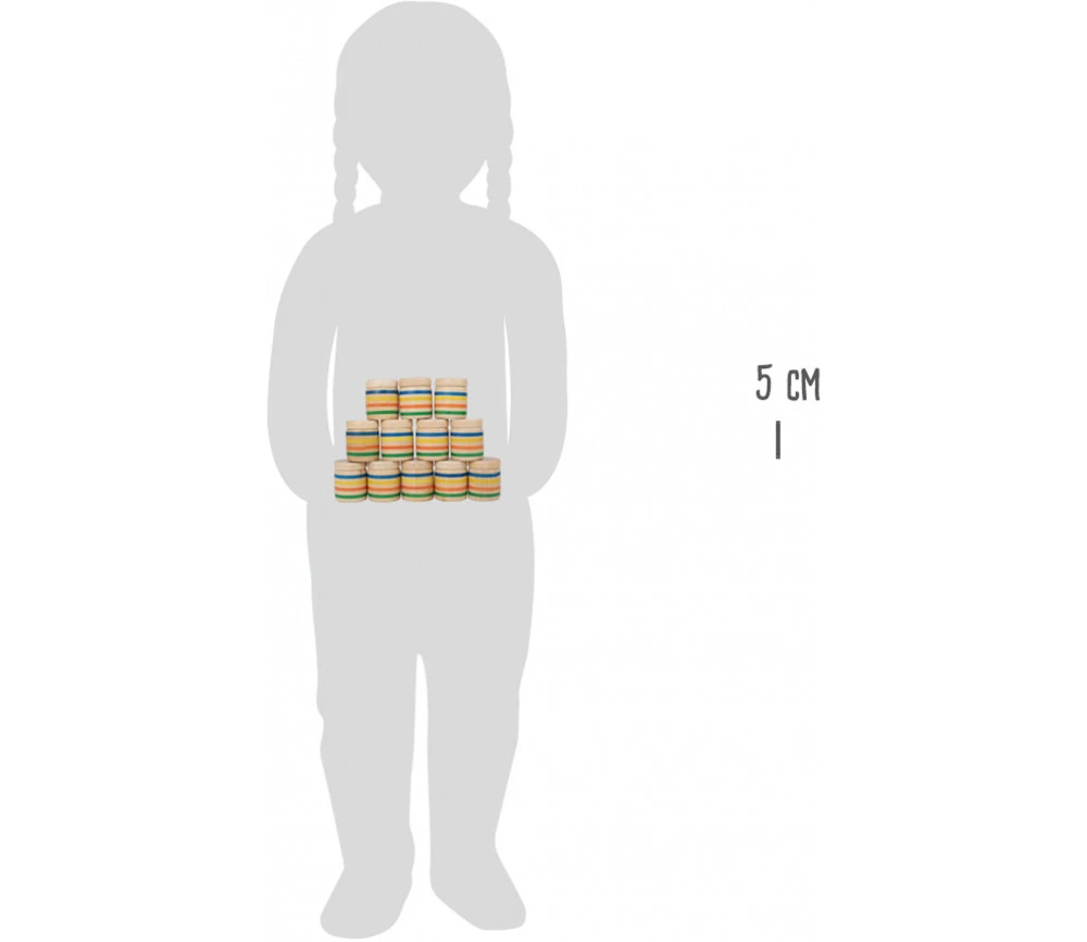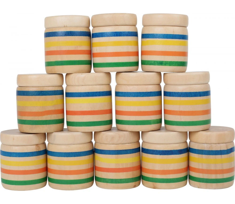 12 boites en bois avec des contenus variés (6 paires). Taille des boites : hauteur 5 cm et diamètre 4 cm.
