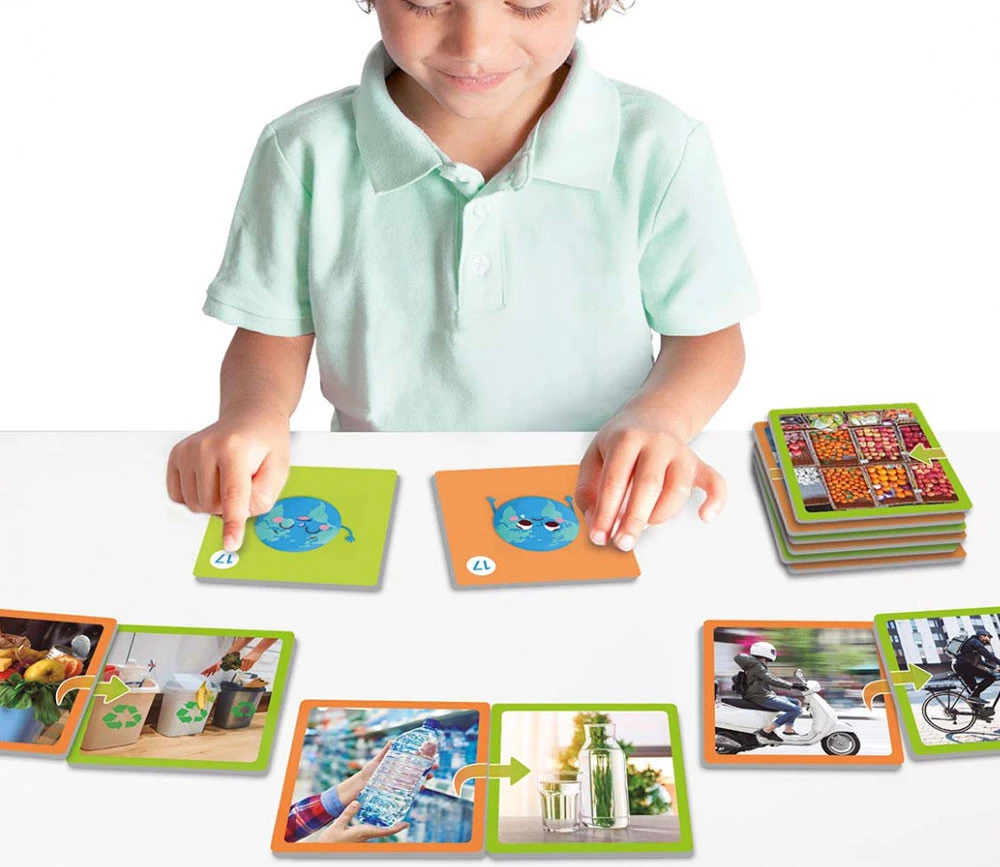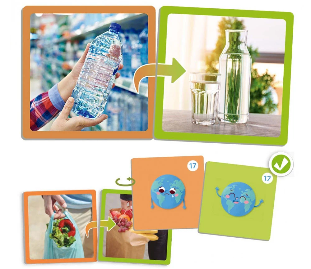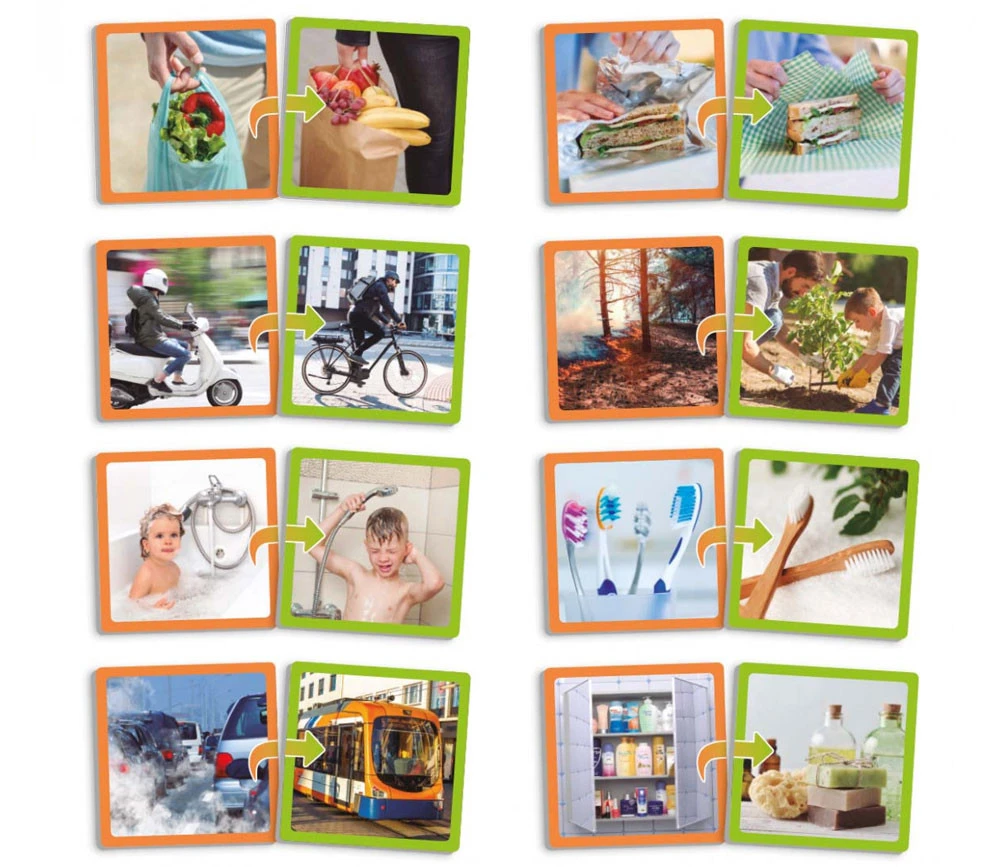 Retrouvez les cartes qui vont ensemble. Base de discussion sur les petits gestes que nous pouvons tous faire au quotidien à travers un jeu avec de belles photographies.