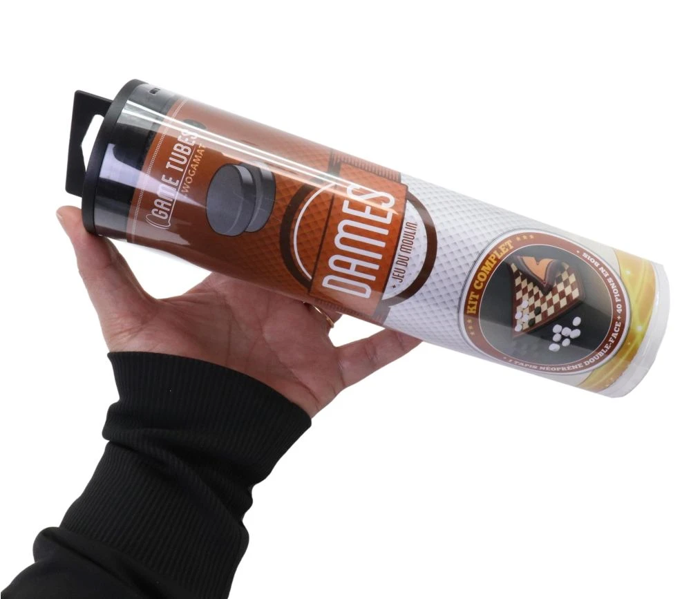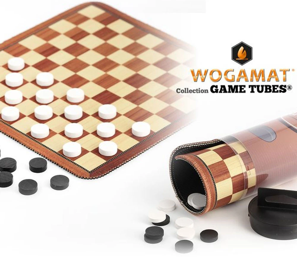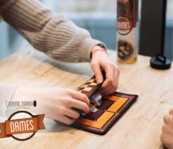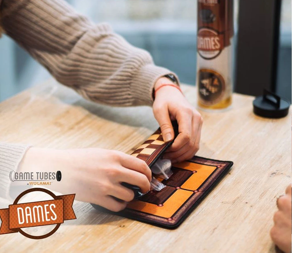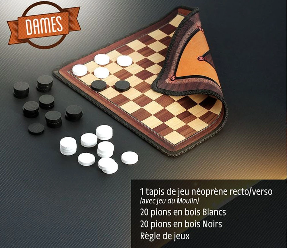 2 jeux en 1 avec ce bel ensemble de tapis et jetons format de voyage. Pour jouer aux dames ou au jeu du moulin il suffit de retourner le tapis.
