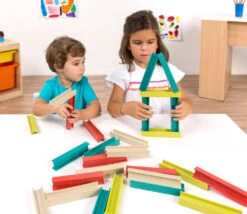 Jeu de construction de qualité avec des pièces colorées facilement emboitables entre elles. Pièces résistantes, lavables et durables composées de résidus de bois issus de forêt éco-gérées. La coloration des pièces est naturelle et peut varier d’une pièce à l’autre, d’un jeu à l’autre.