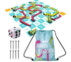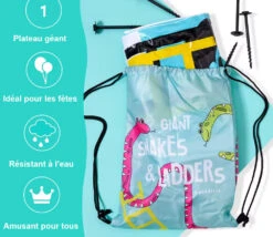 Jeu géant de parcours ressemblant au jeu de l’oie. Les joueurs devront parcourir le plateau en essayant de monter sur les échelles ou en glissant sur des serpents. Un jeu familial taille géante pour jouer au sol.