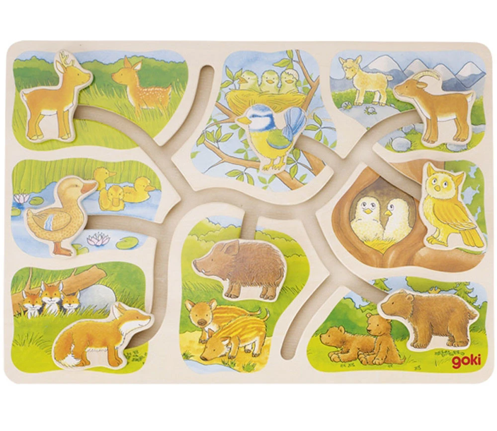 Puzzle coulissant où l’enfant devra faire glisser les animaux pour qu’ils retrouvent leur petit.