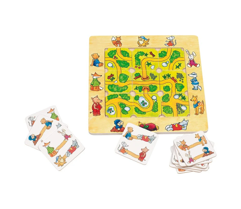 Puzzle labyrinthe en bois. Le plateau de jeu est une grande forêt dans laquelle se trouvent des chemins. La forêt sépare les animaux les uns des autres. Et ceux-ci ne peuvent se voir qu’en passant par ces chemins. Si un animal souhaite rencontrer un autre animal, le joueur doit construire un chemin. Mais son adversaire souhaite lui aussi aider ses animaux à se rencontrer. Le gagnant est celui qui permet la rencontre de ses deux animaux.
