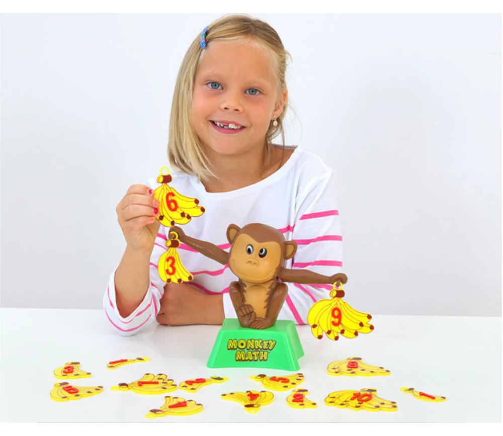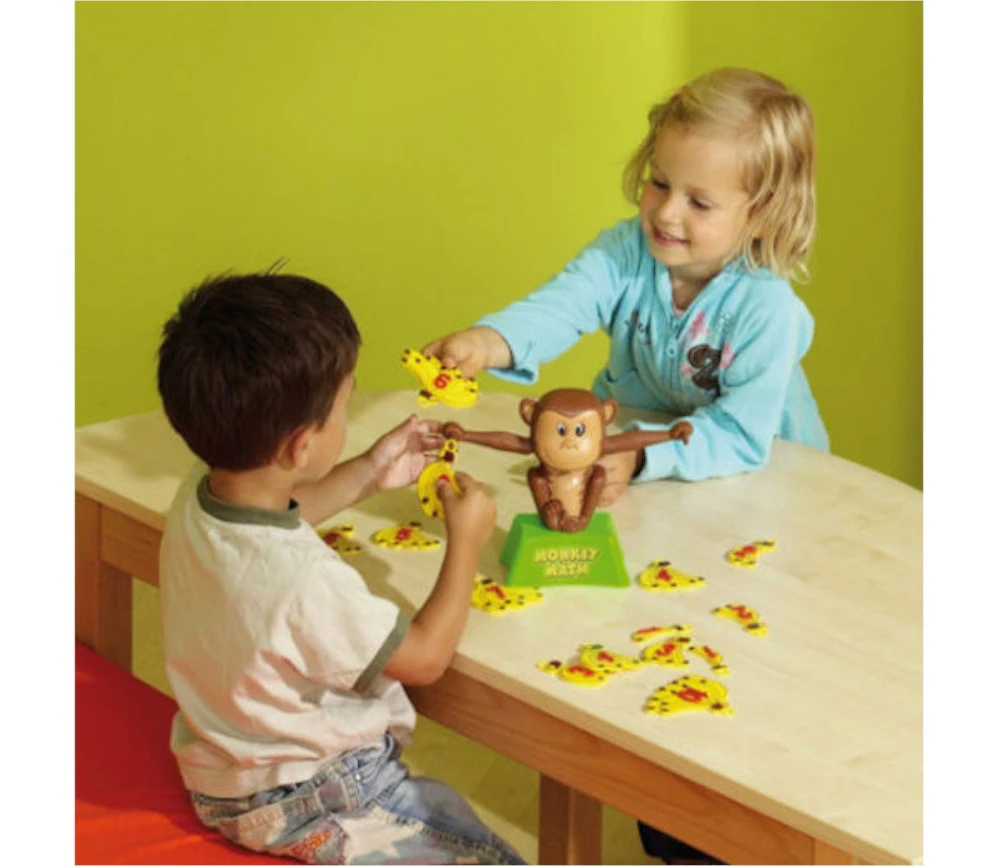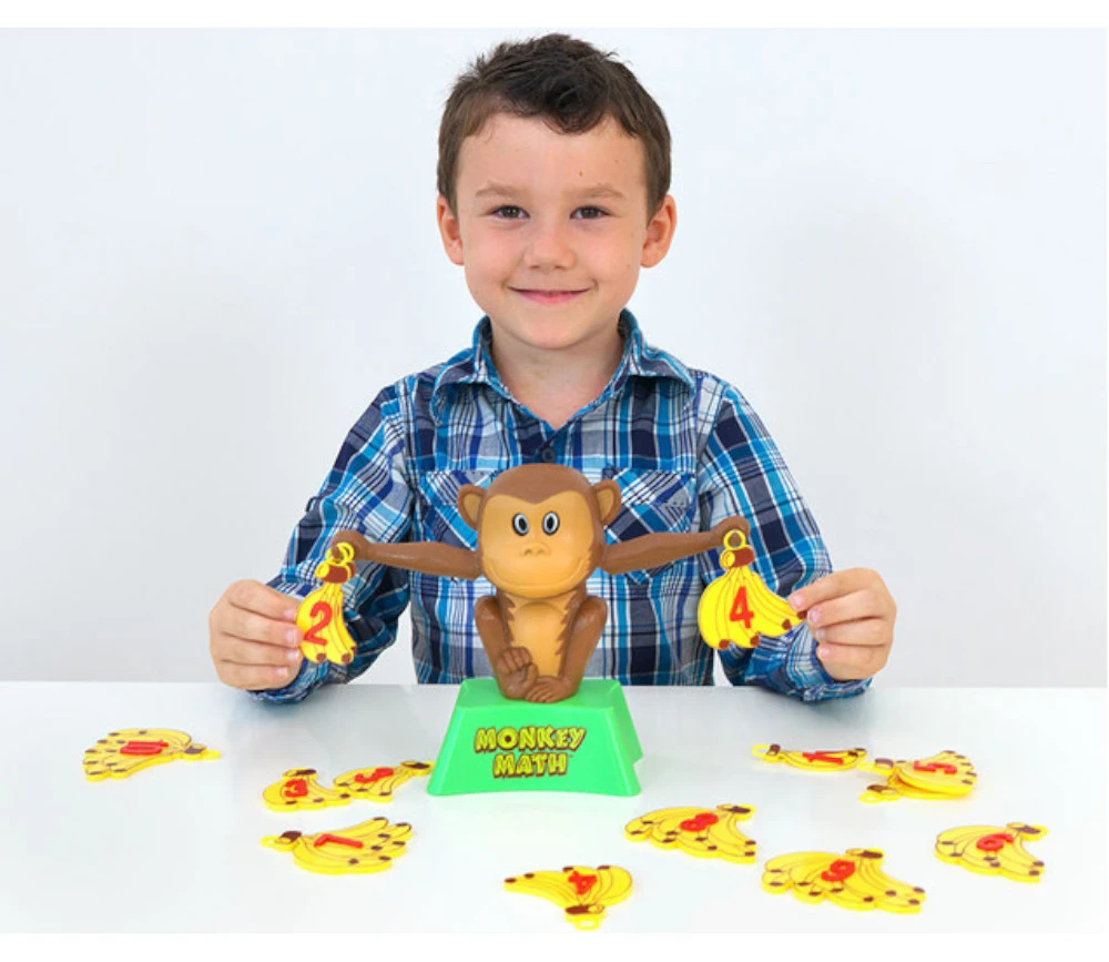 Jeu de mathématique éducatif amusant pour faire des calculs et apprendre en s’amusant. Accrochez le bon nombre de bananes sur les bras du singe.