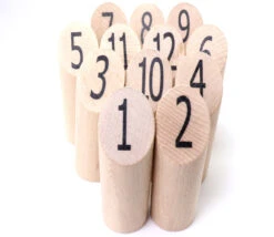 - 12 quilles en bois numérotées de 1 à 12. Hauteur des quilles 15 cm et 5 cm de diamètre