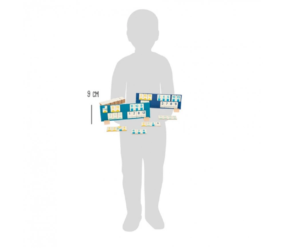 - 106 tuiles numérotées de 4 x 2.5 cm. 2 séries complètes de chiffres de 1 à 13 en 4 couleurs + 2 jetons joker neutre