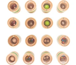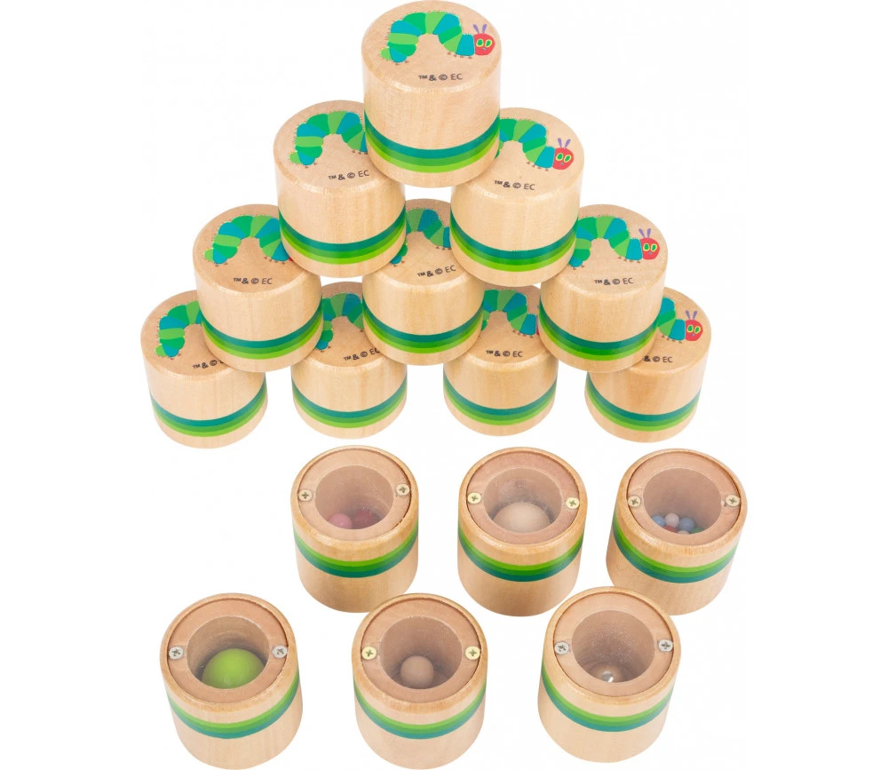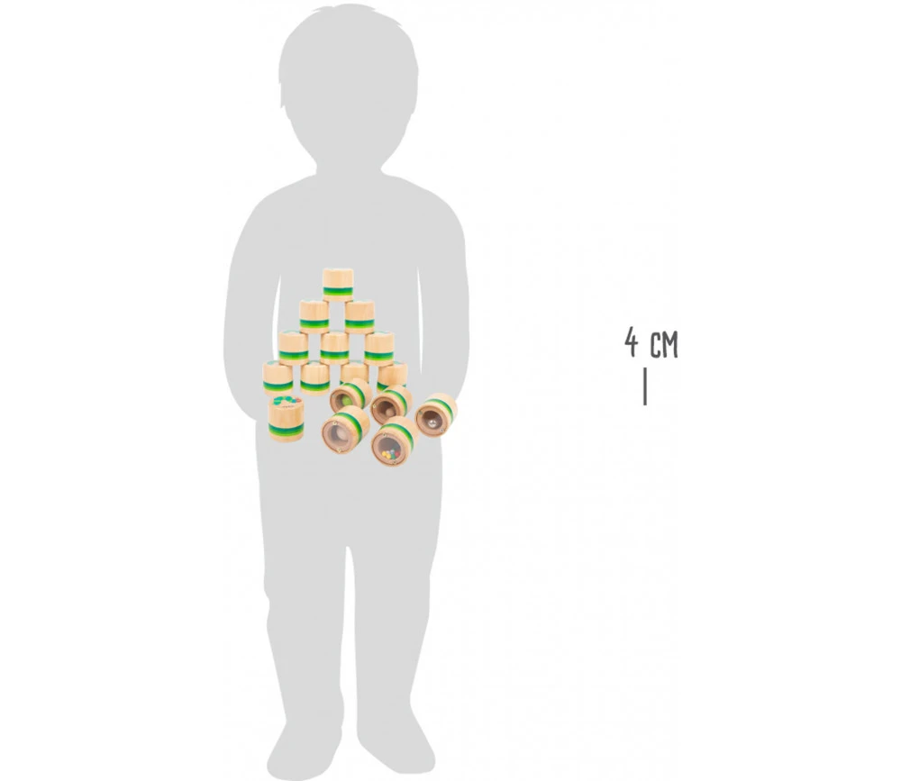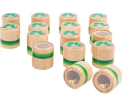 16 boites en bois avec des contenus variés (8 paires). Taille des boites : hauteur 4 cm et diamètre 4 cm. Très joli décor dans les tonalités vertes avec une chenille sur le dessus.