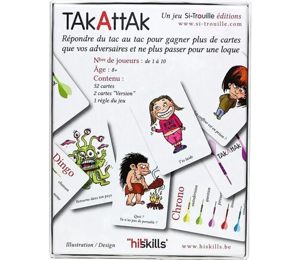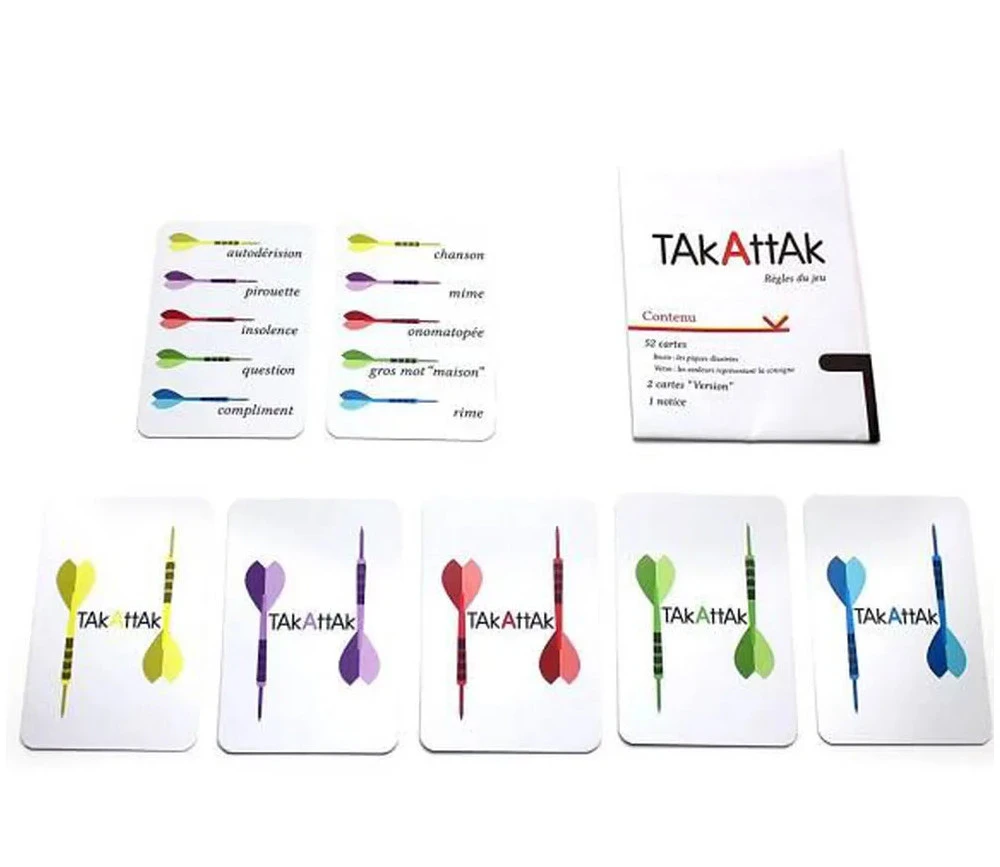 TAKATTAK à la récré, jeu coopératif de 54 cartes pour apprendre à répliquer quand on nous fait une remarque méchante ou moqueuse. Un jeu qui permet de mieux manier notre belle langue française et qui permet de désamorcer des situations parfois compliquées pour les enfants dans la cour de récréation.