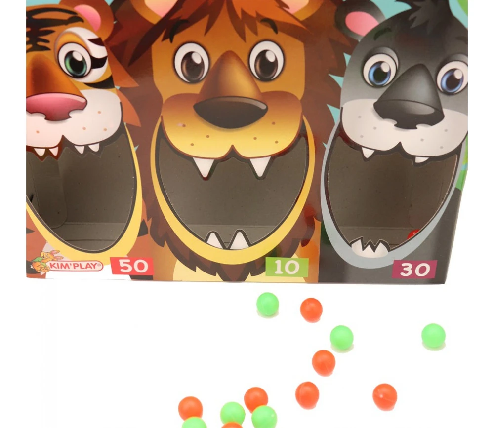 - Jeu Gueule de lions pour lancer de balles avec 1 boite de 28 x 21.5 x 5.5 cm + boules de 1.5 cm de diamètre (10 oranges et 10 vertes)