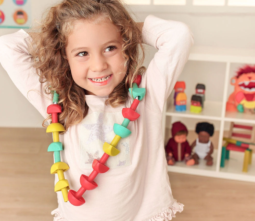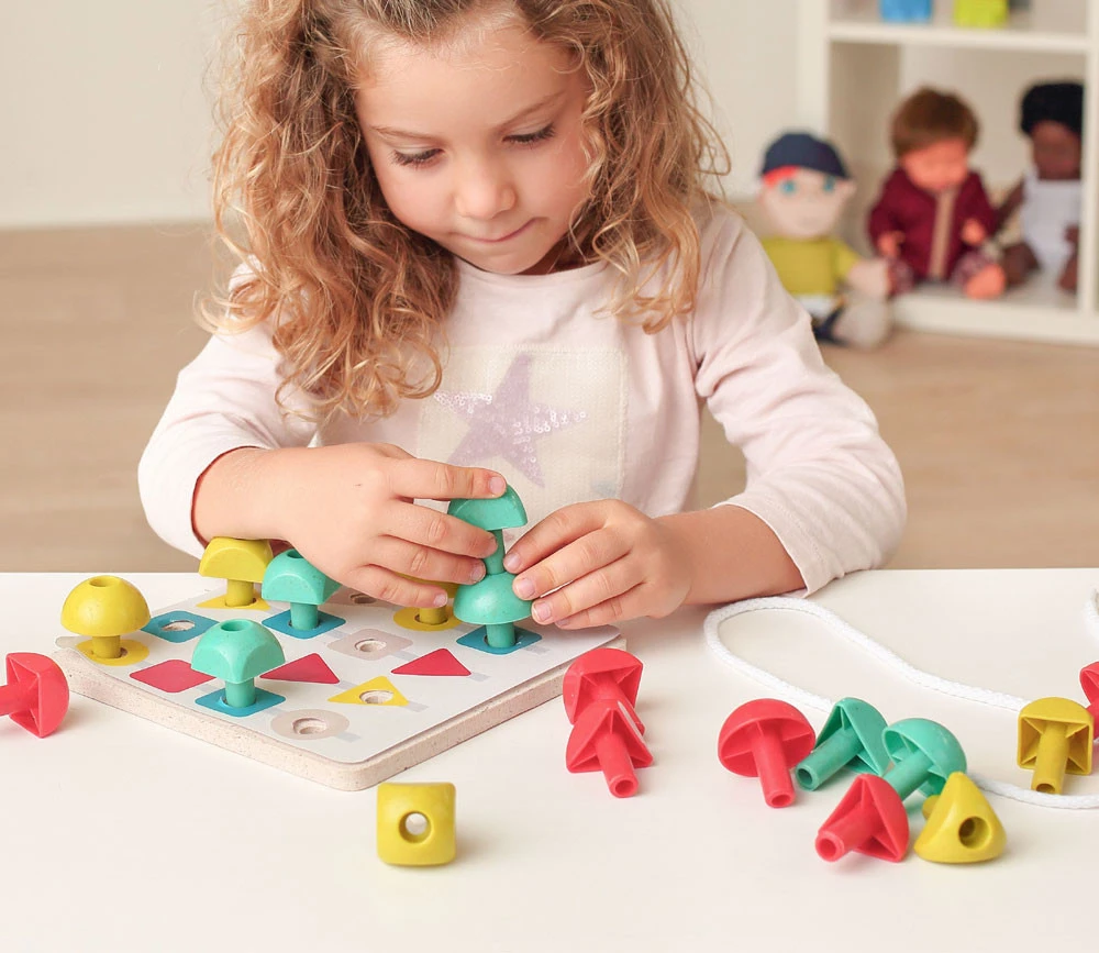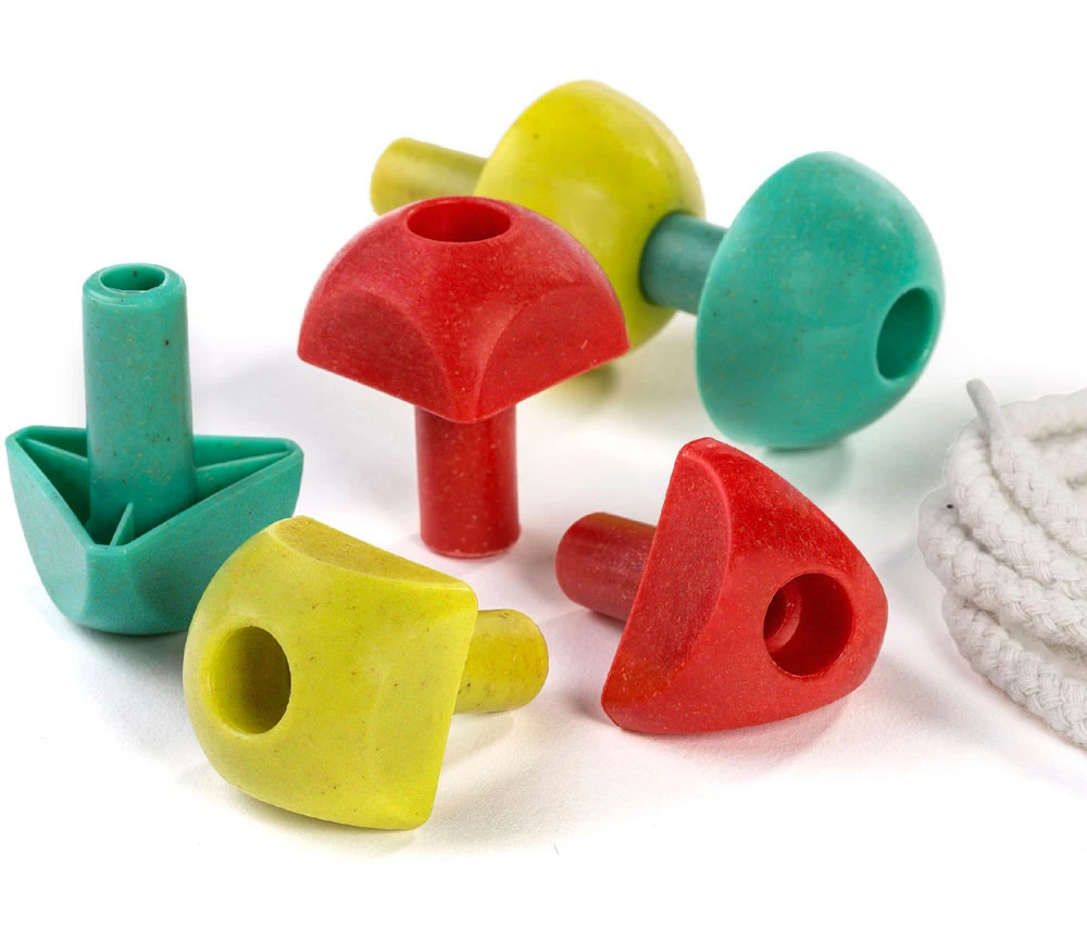 Jeu de motricité fine réalisé avec des matériaux écoresponsables (bois fibres d’épicéa, mousse recyclée et lacets en coton).