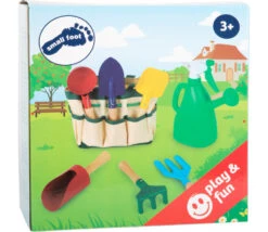 Jouet sac de jardin avec compartiments pour rangement des outils et arrosoir/pulvérisateur.