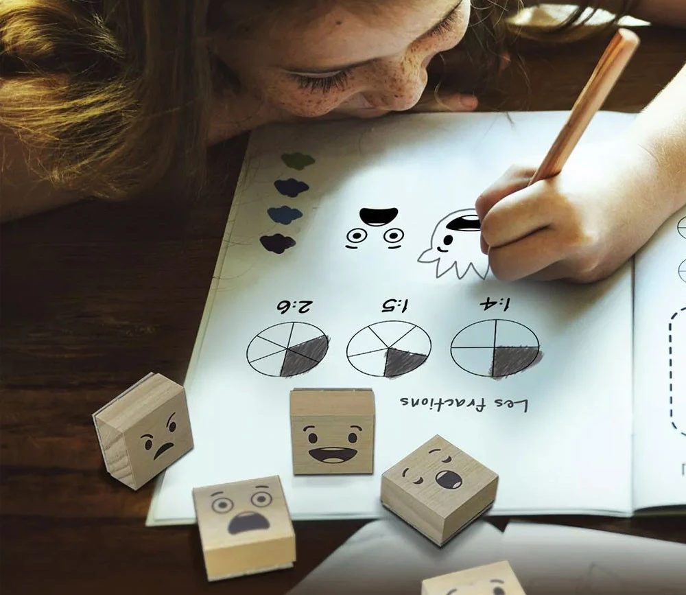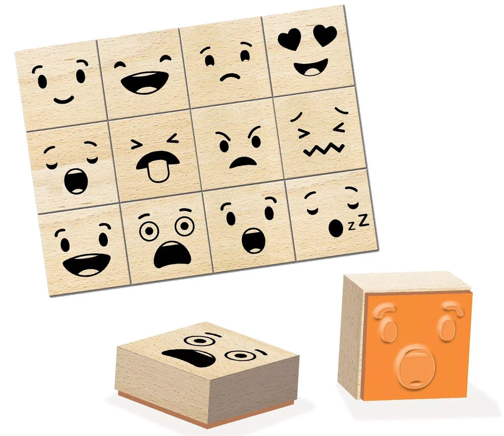 Set de 12 tampons en bois avec des expressions de visage. Matériel pour les activités pédagogiques avec les enfants.