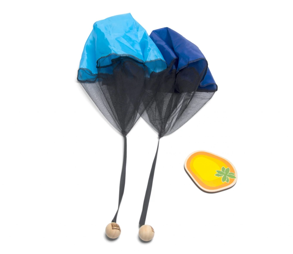Mini jeu de pétanque en bois avec des boules volantes ! Accrochées à de petits parachutes, lancez les petites boules vers le cochonnet représenté par un palet-jeton en forme d’île