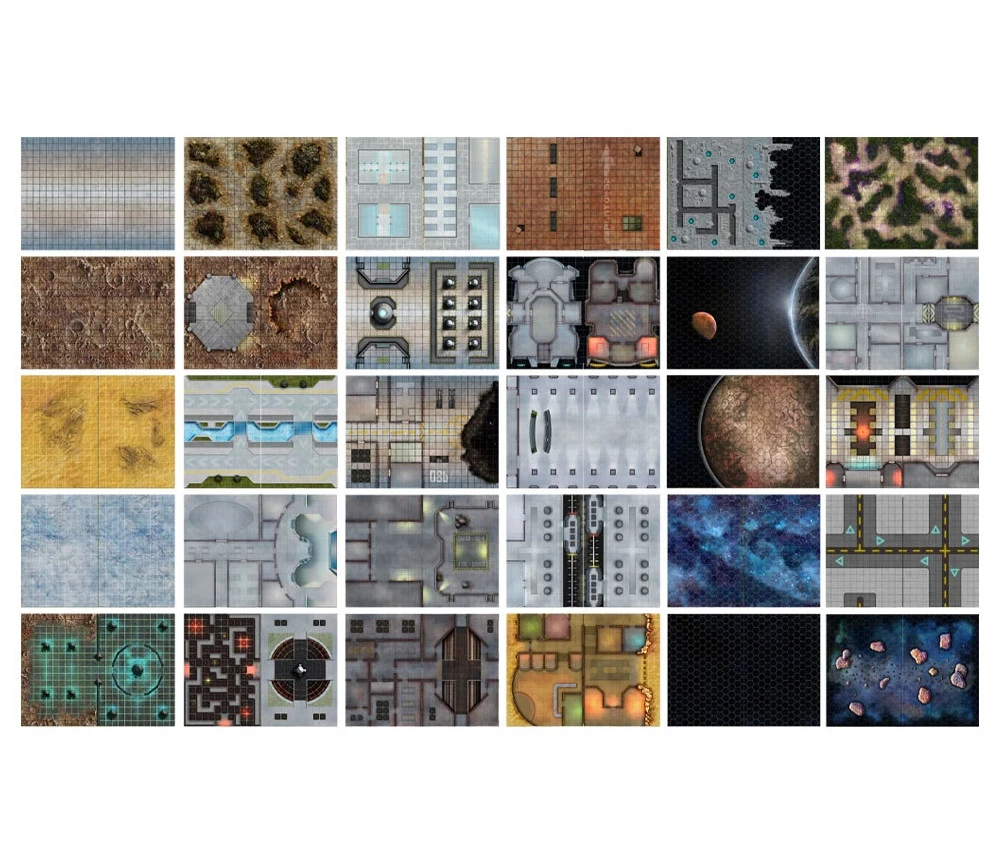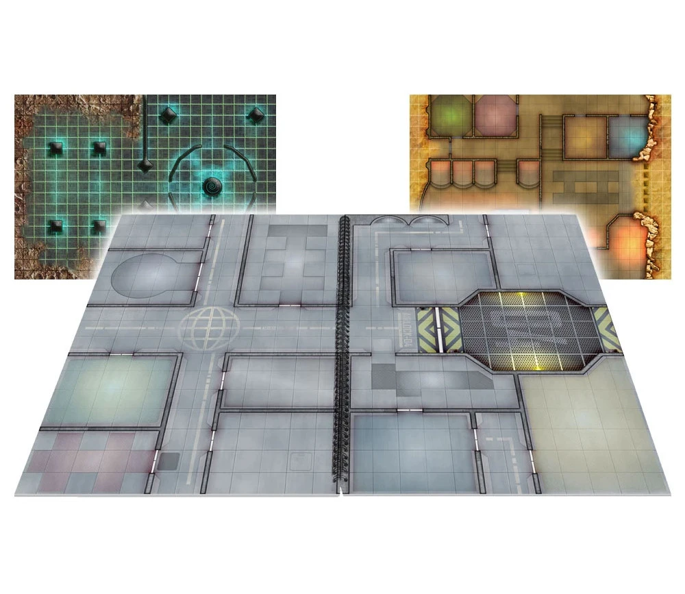 62 pages de cartes/plateau quadrillées (quadrillage de 2.5 x 2.5 cm ou en hexagone pour les vaisseaux) à poser à plat et à utiliser sur 2 pages.