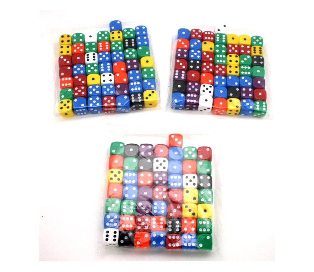 50 Dés à jouer en plastique classique 1,6 x 1,6 cm de côté numérotés de 1 à 6 avec des points (couleurs variées différentes selon les lots).
