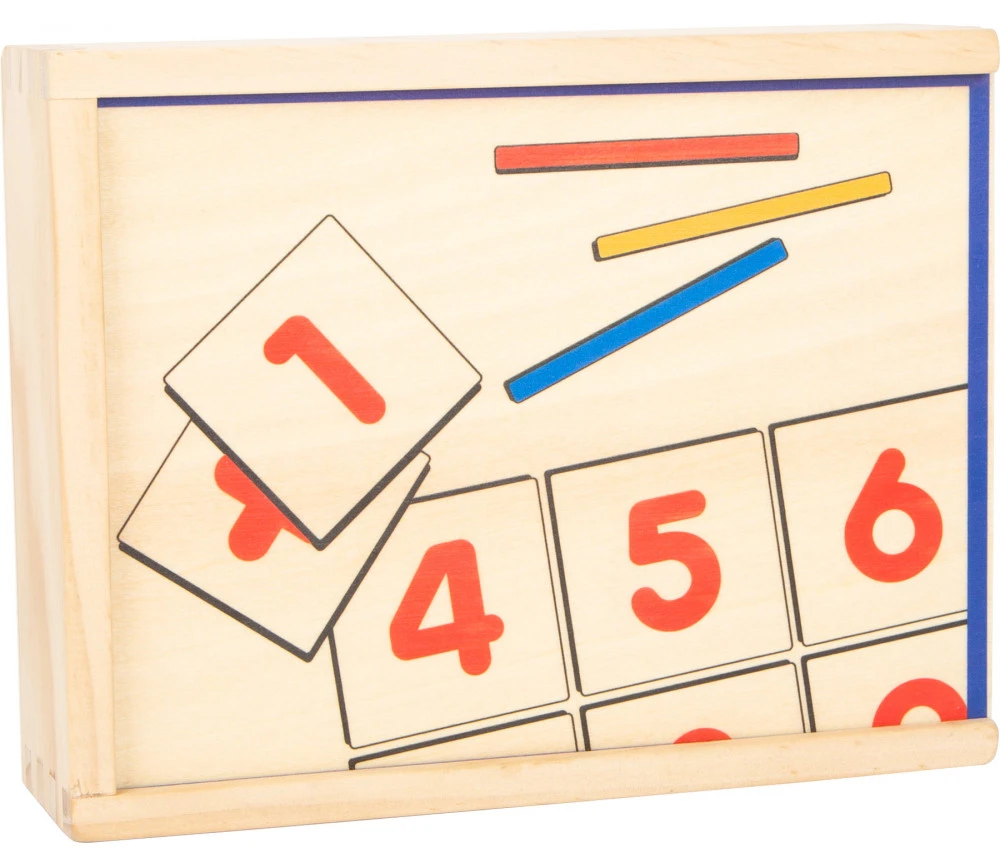 Boite de plaques et réglettes en bois pour l’apprentissage des opérations mathématiques.