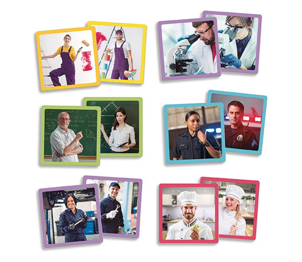 Maxi mémory 34 cartes pour jouer à la découverte des métiers et professions. Les métiers les plus connus sont représentés sur les cartes avec de belles photos.
