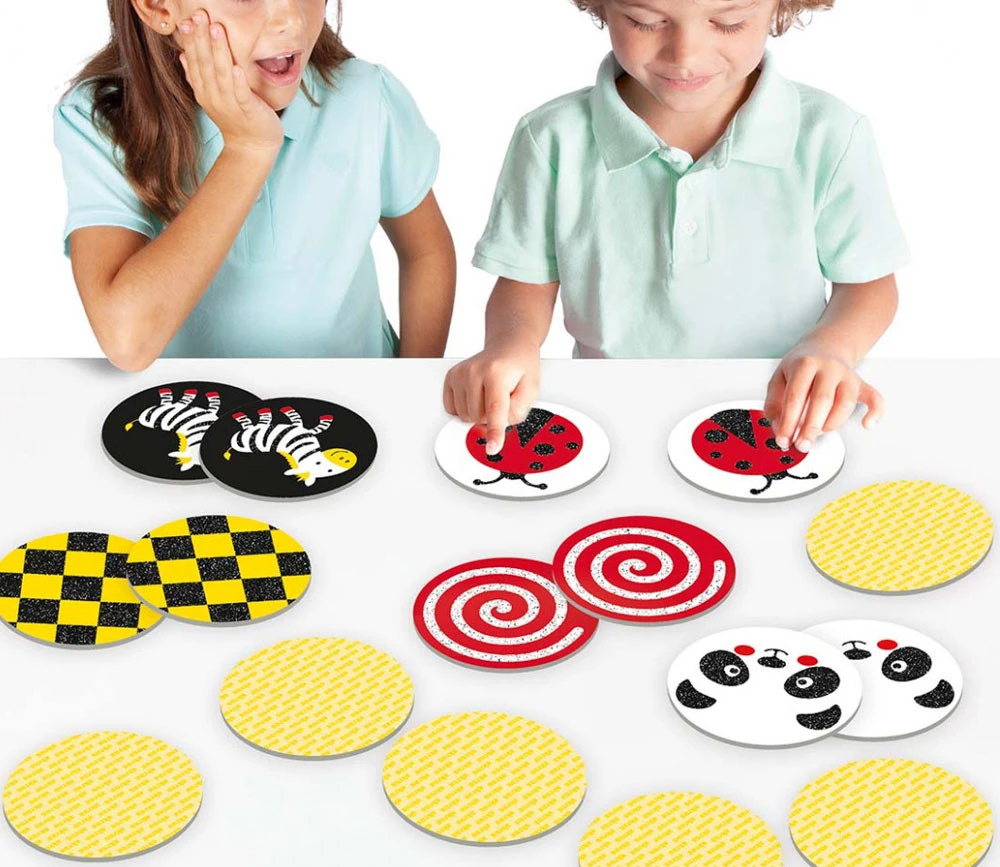 Disposez sur la table les cartes faces cachées et retrouvez les paires seulement grâce au toucher. Jeu éducatif pour développer la mémoire visuelle et tactile.
