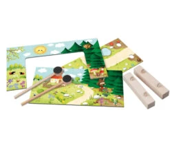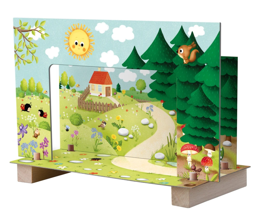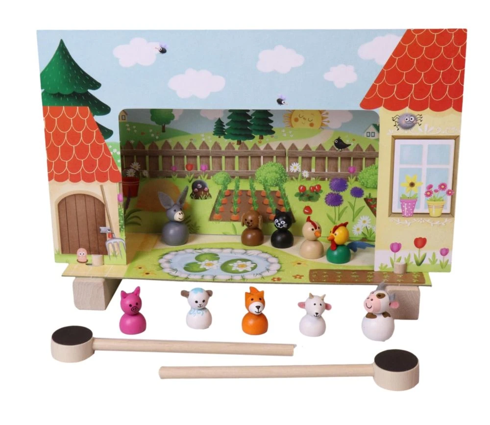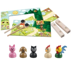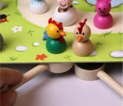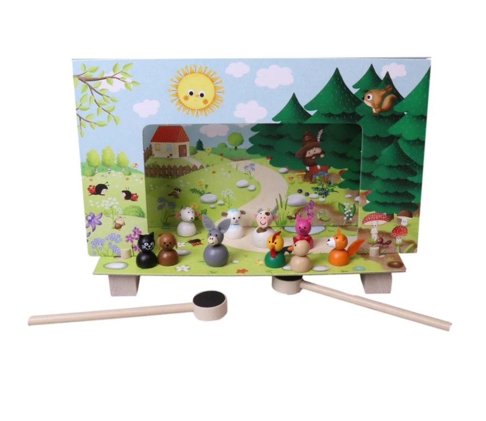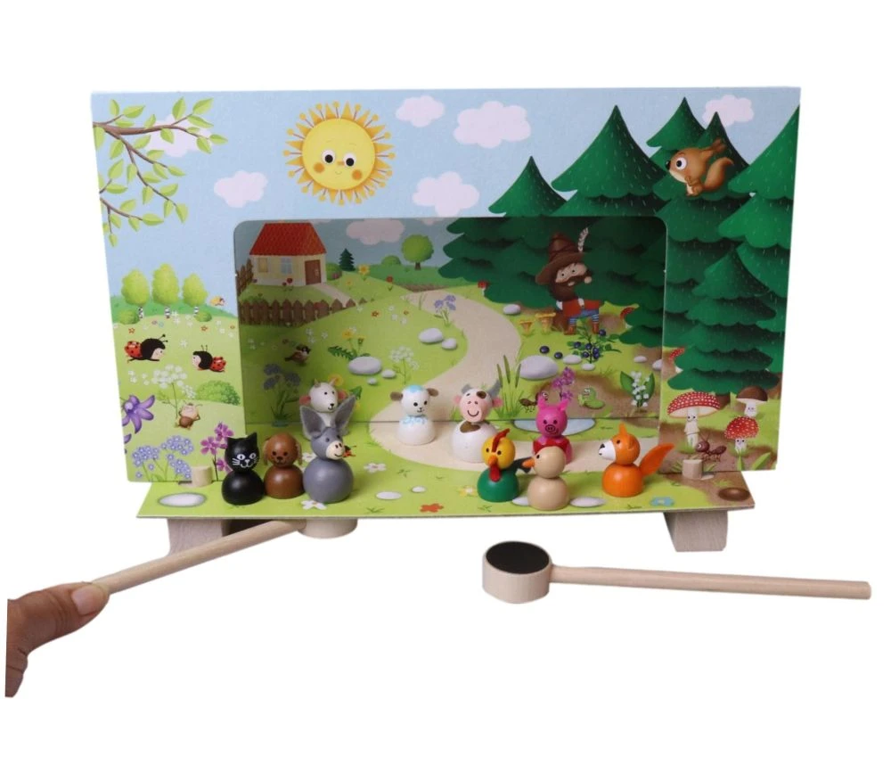 Petit Théâtre en bois les animaux de la ferme magnétiques. Petites marionnettes personnages en bois à bouger avec des petites baguettes. A vous de créer et inventer vos histoires.