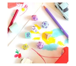 Set de 7 dés multi-faces pastel : 1 D4, 1D6, 1D8, 2D10, 1D12, 1D20.