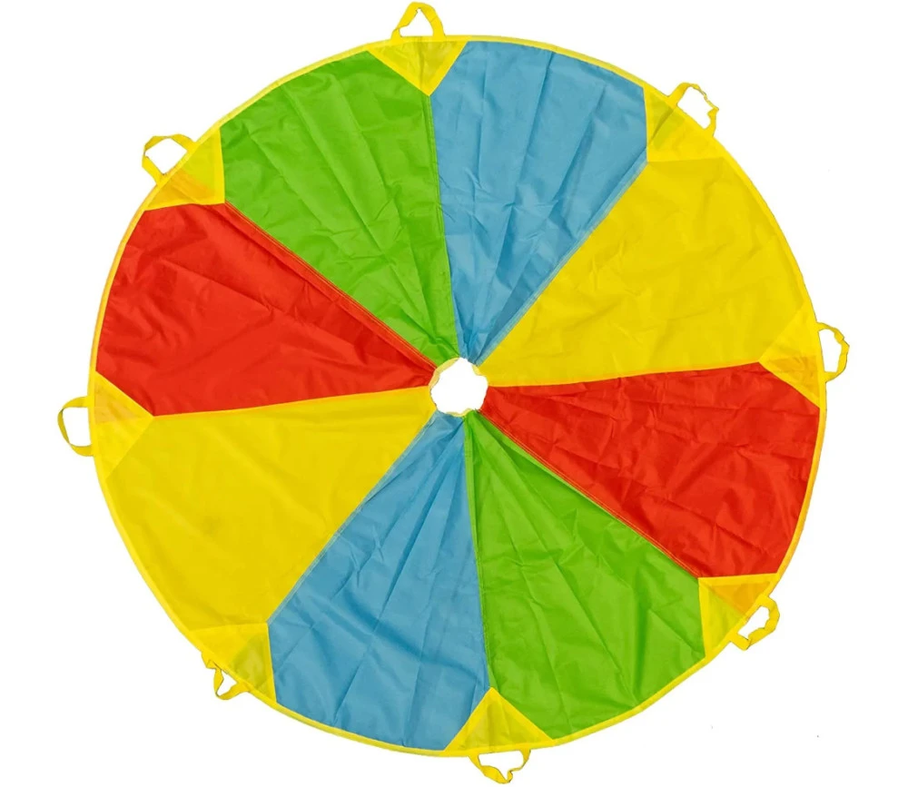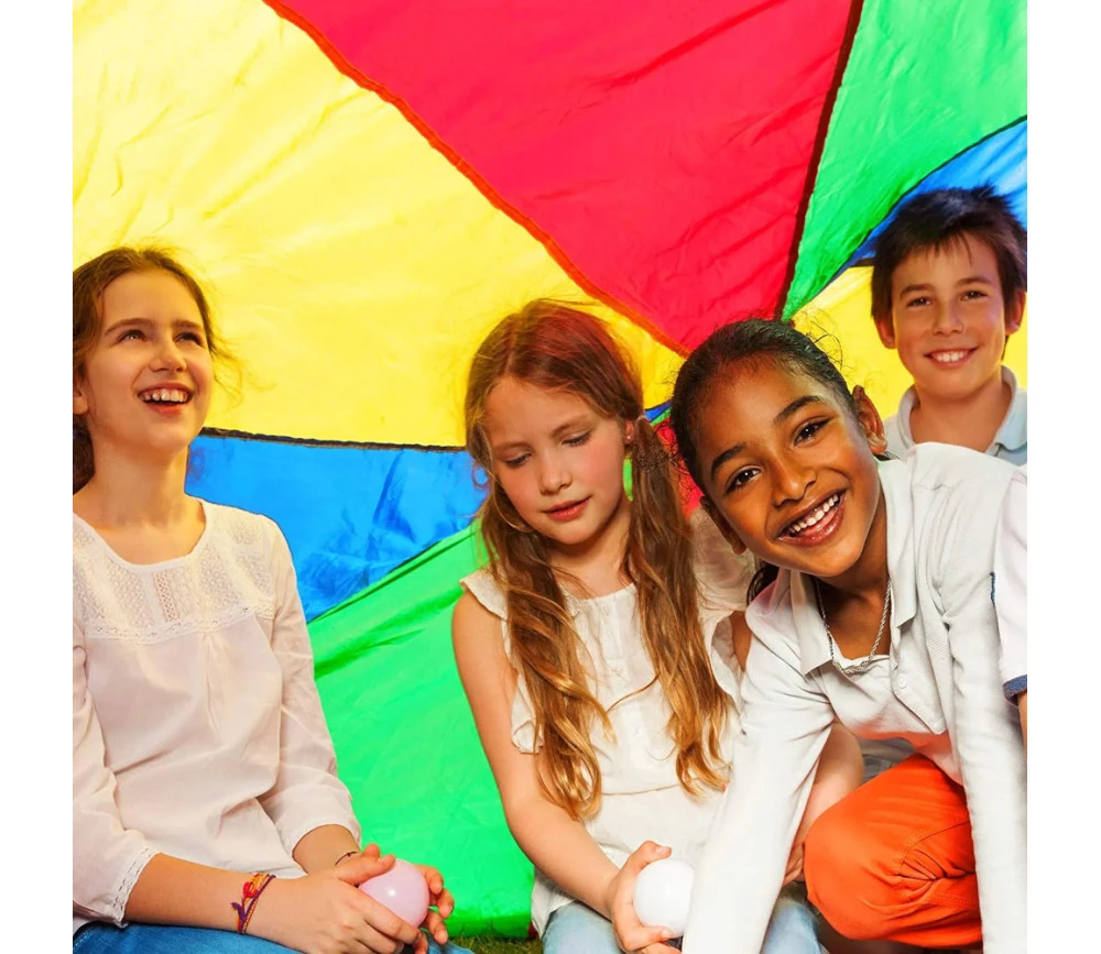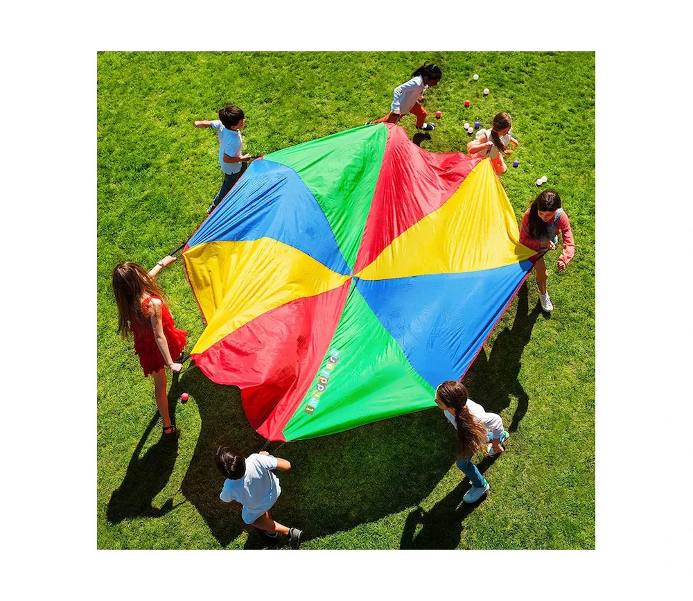 Jeu parachute de coordination pour animation, école, cours de théâtre, crèche et centres de loisirs. Jeu coopératif pour jouer en intérieur ou en plein air pour jouer en groupe. Poser une balle ou un ballon sur le dessus du parachute et les joueurs devront se synchroniser pour faire déplacer le ballon ou les balles à l’endroit souhaité.