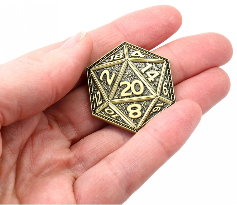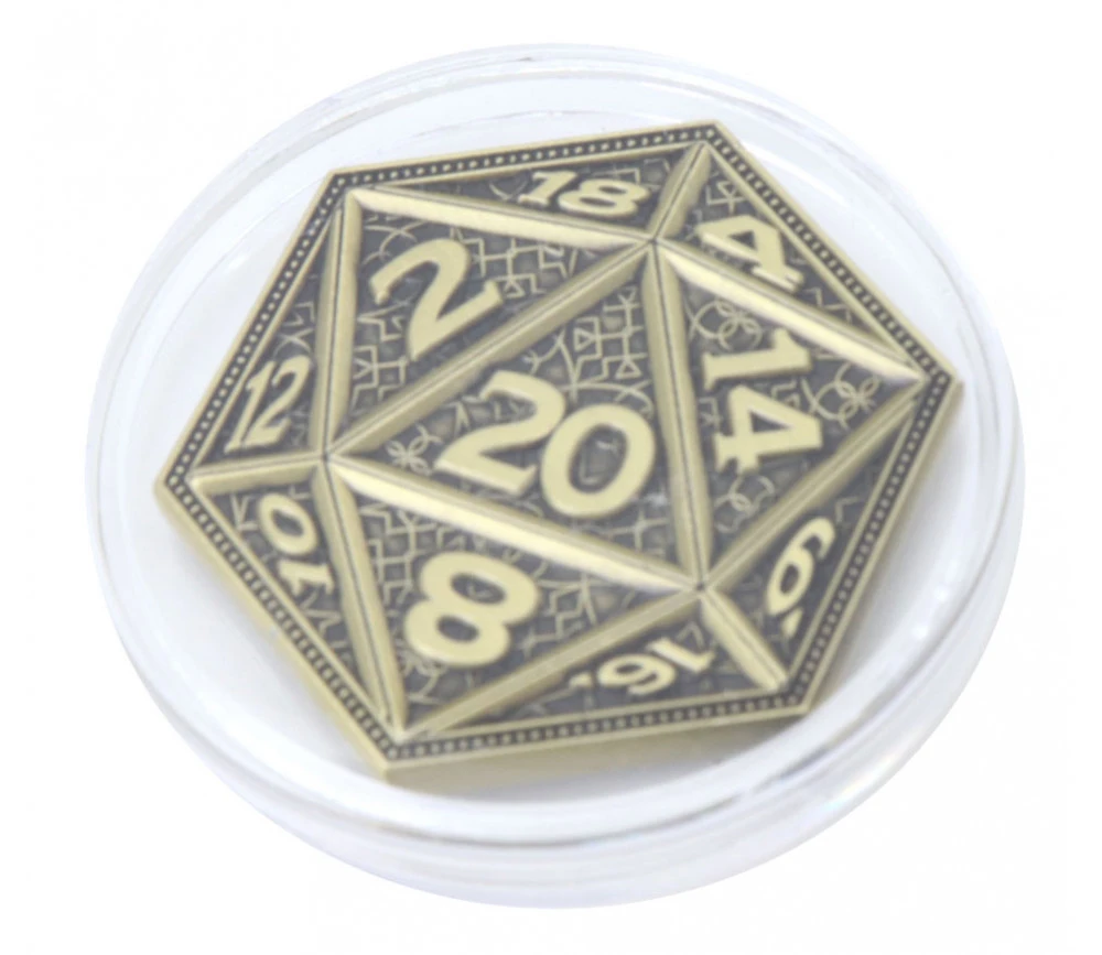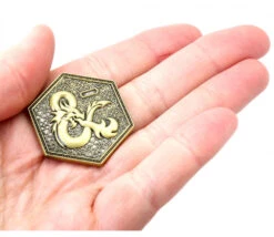 Pièce métal de 38 mm avec logo Donjons et Dragons sur une face et triangles de chiffres sur l’autre face.