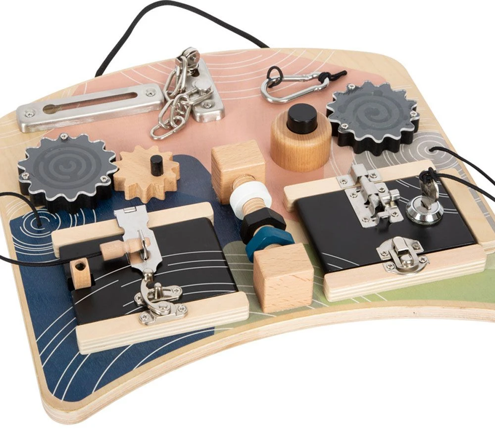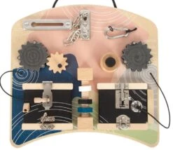 Planche en bois de motricité avec des serrures et des engrenages. Outil de jeu pédagogique pour la motricité fine méthode Montessori. Apprendre par l’expérimentation.
