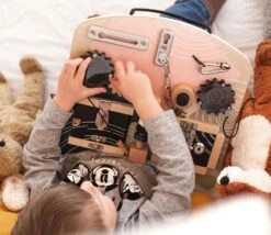 Support en bois teinté avec des couleurs tendances avec différents systèmes d’ouverture – fermeture : serrure, glissière, clapet. Matériel coloré adapté à la main de l’enfant, exercice de motricité fine.