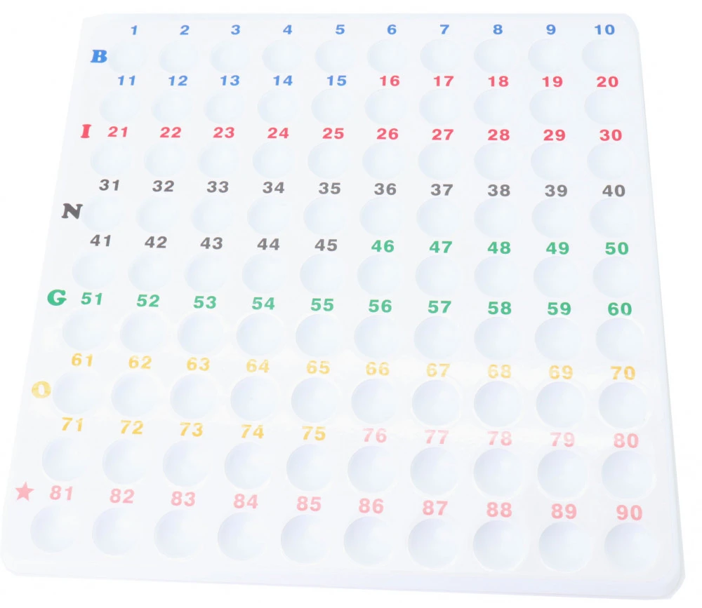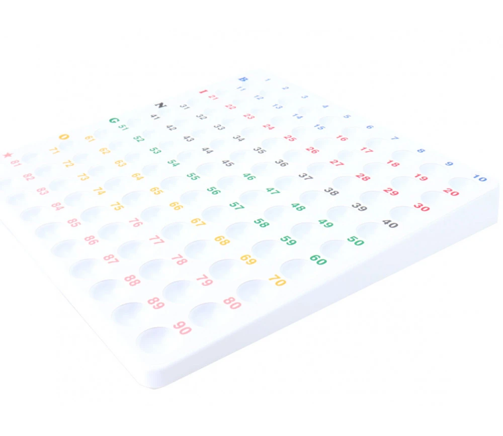 Plateau de contrôle de loto pour tirage des numéros et réceptionner les boules (non fournies) dans les cases creuses et numérotées.