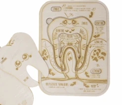 Jeu éducatif avec 3 pièces à positionner sur un cadre illustré avec les descriptifs complets d’une dent et ce qu’il y a autour.